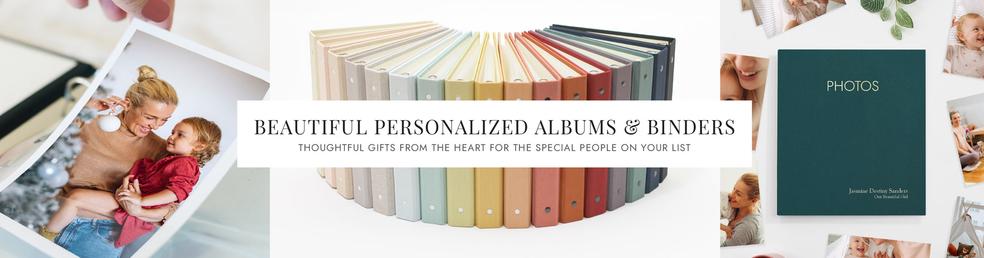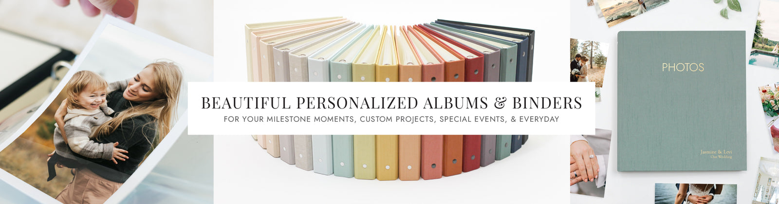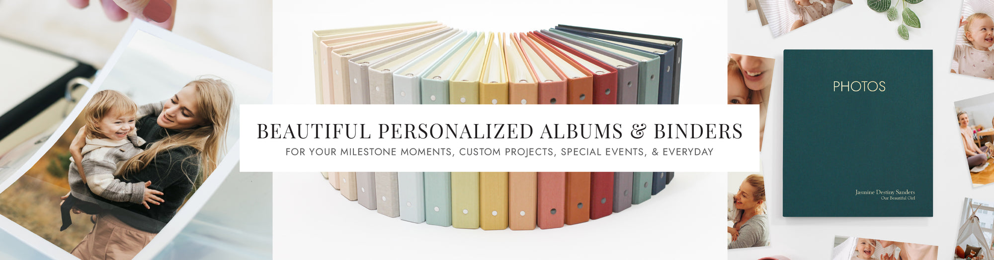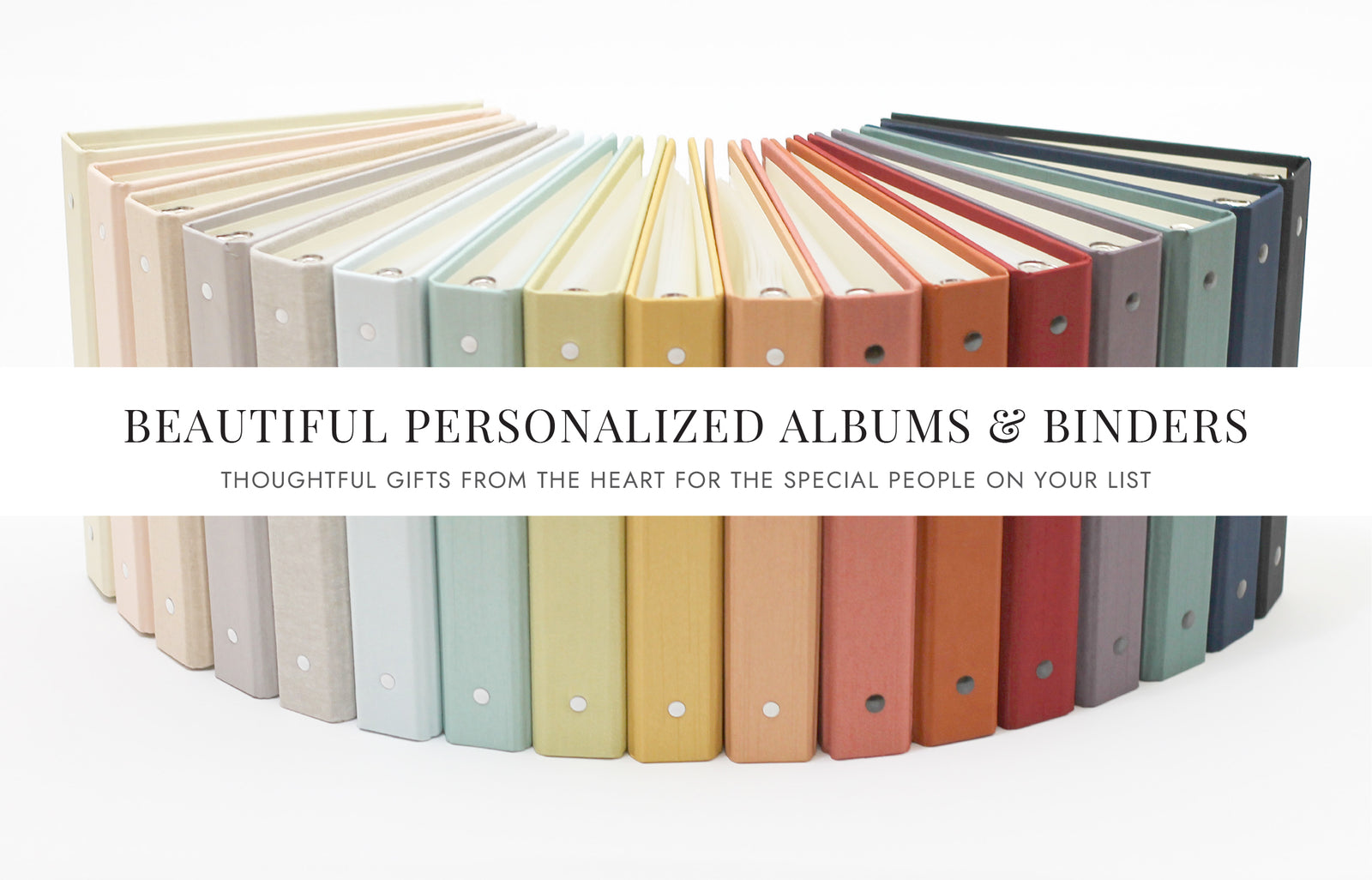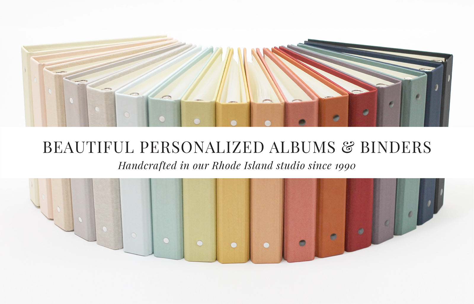 Our most versatile binder is available with customized embossing options for the spine, title and front cover, as well as optional sleeves for 4x6, 5x7, 8x10 photos and standard 8.5x11 paper pages. Custom Binders are perfect for special events, professional projects, weddings, new babies, family photos and more and are available in several colorful Silk, Linen, Cotton and Vegan Leather cover options.