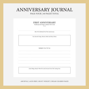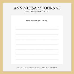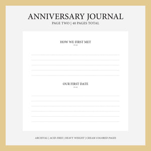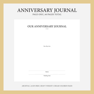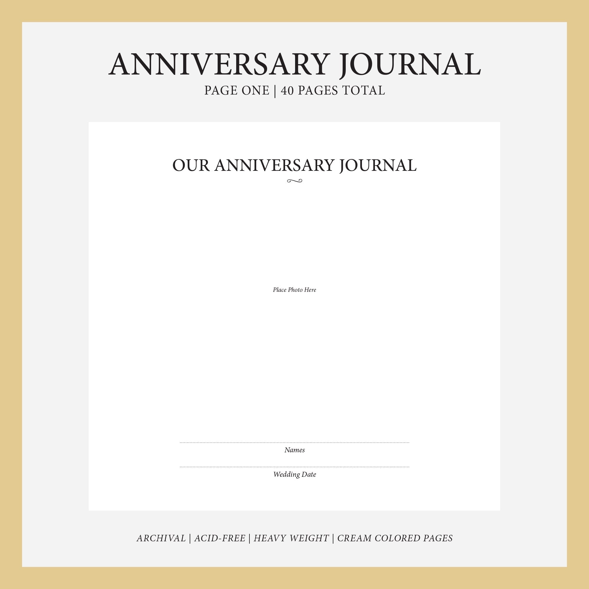 Our handcrafted Anniversary Journals span 25 years with pages to record personal notes and memorable events from each year as well as photos and prompts to guide reflections and future aspirations. Whether you're looking for a special wedding present, a thoughtful album for the traditional first "Paper Anniversary", or a gift for your favorite couple just beginning their journey together, a personalized Anniversary Journal is sure to become a treasured keepsake. The language throughout is gender neutral and appropriate for all loving couples.