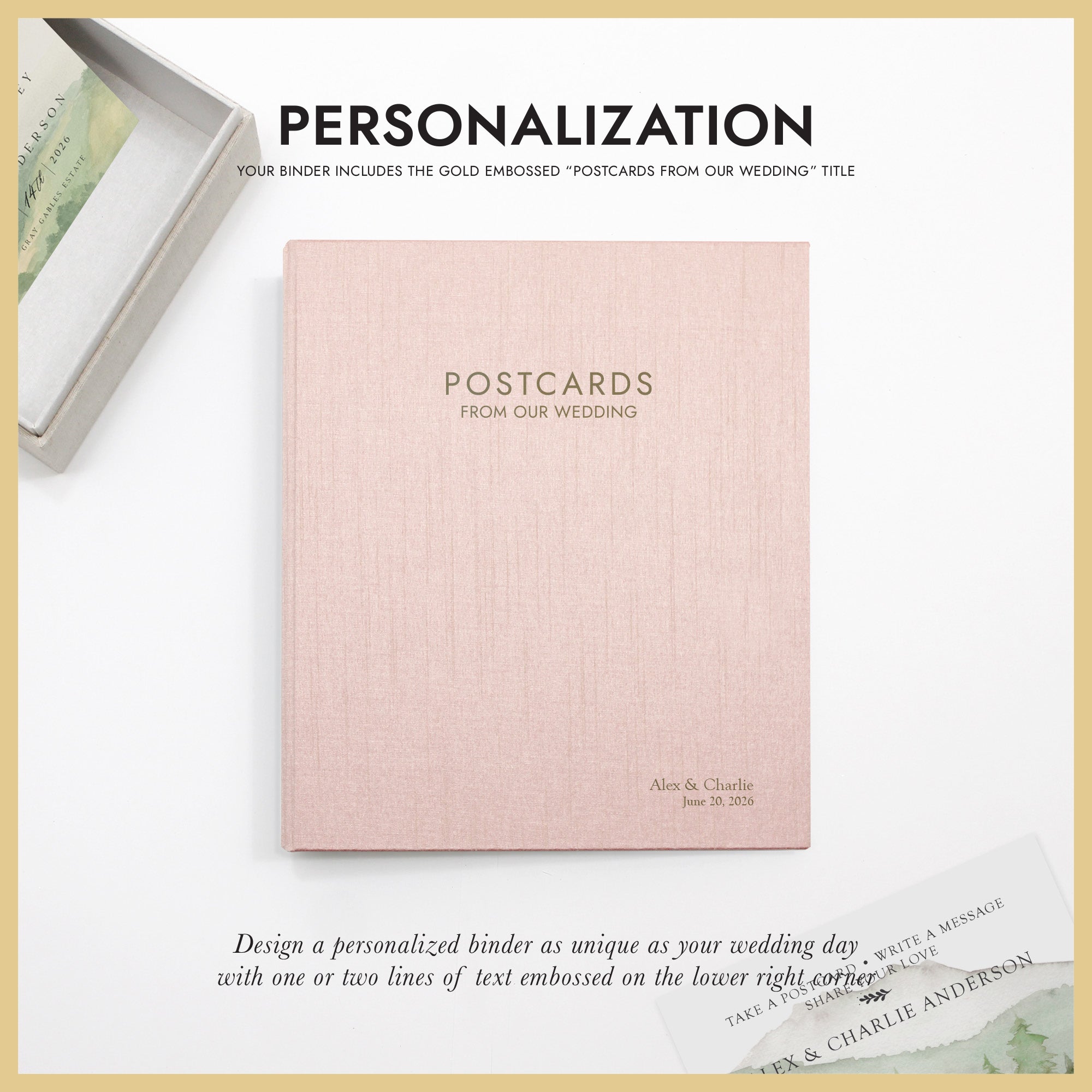 COVER: The cover is gold embossed with POSTCARDS FROM OUR WEDDING. This embossed title is included in the price. This title is not editable at this time.