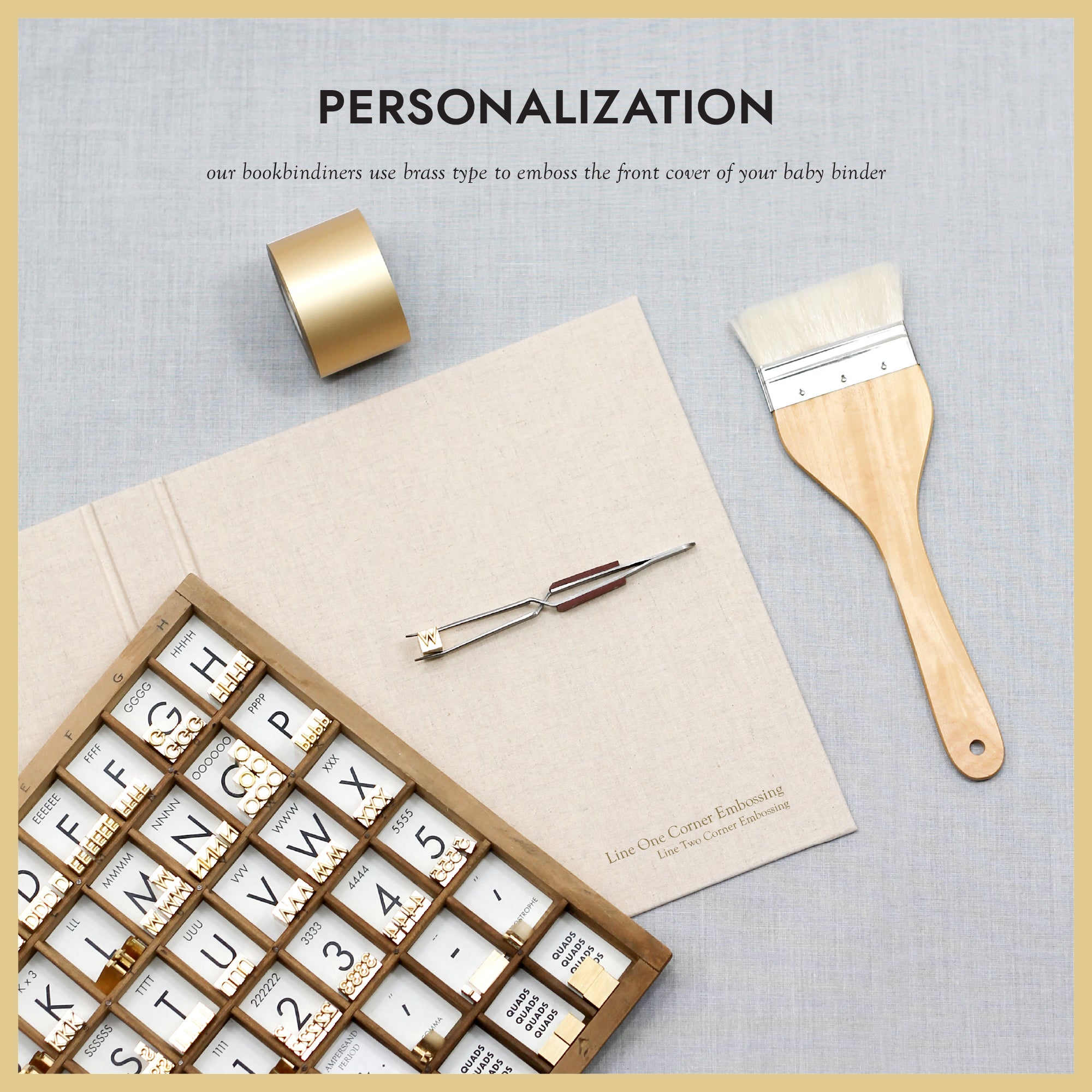Add a distinctive touch to your Baby Photo Binder with custom embossing. We can emboss baby's name and birthdate, or a short message (up to 25 characters per line) on the front cover in our classic Goudy font. Just enter your desired text in the "Click To Emboss..." fields, and we'll take care of the rest. The gold embossed Baby Bunny icon on the front cover is included in the price.