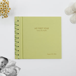 EMBOSSING: Personalize your Baby Book with baby’s name & optional birthdate embossed right on the front cover for a unique one-of-a-kind Baby Book. The font we use is Goudy, and we can emboss up to 25 characters per line. See additional product images for embossing examples & details. If no personalization is selected, the Baby Book will still include the embossed "MY FIRST YEAR" title.