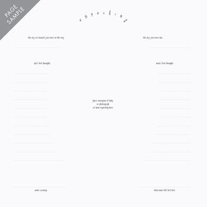 INSIDE: 24 bright white, heavy-weight printed pages with prompts from birth to first birthday and room for photos. The Memories page includes a vellum envelope to capture clippings from baby's first haircut or other sweet mementos.