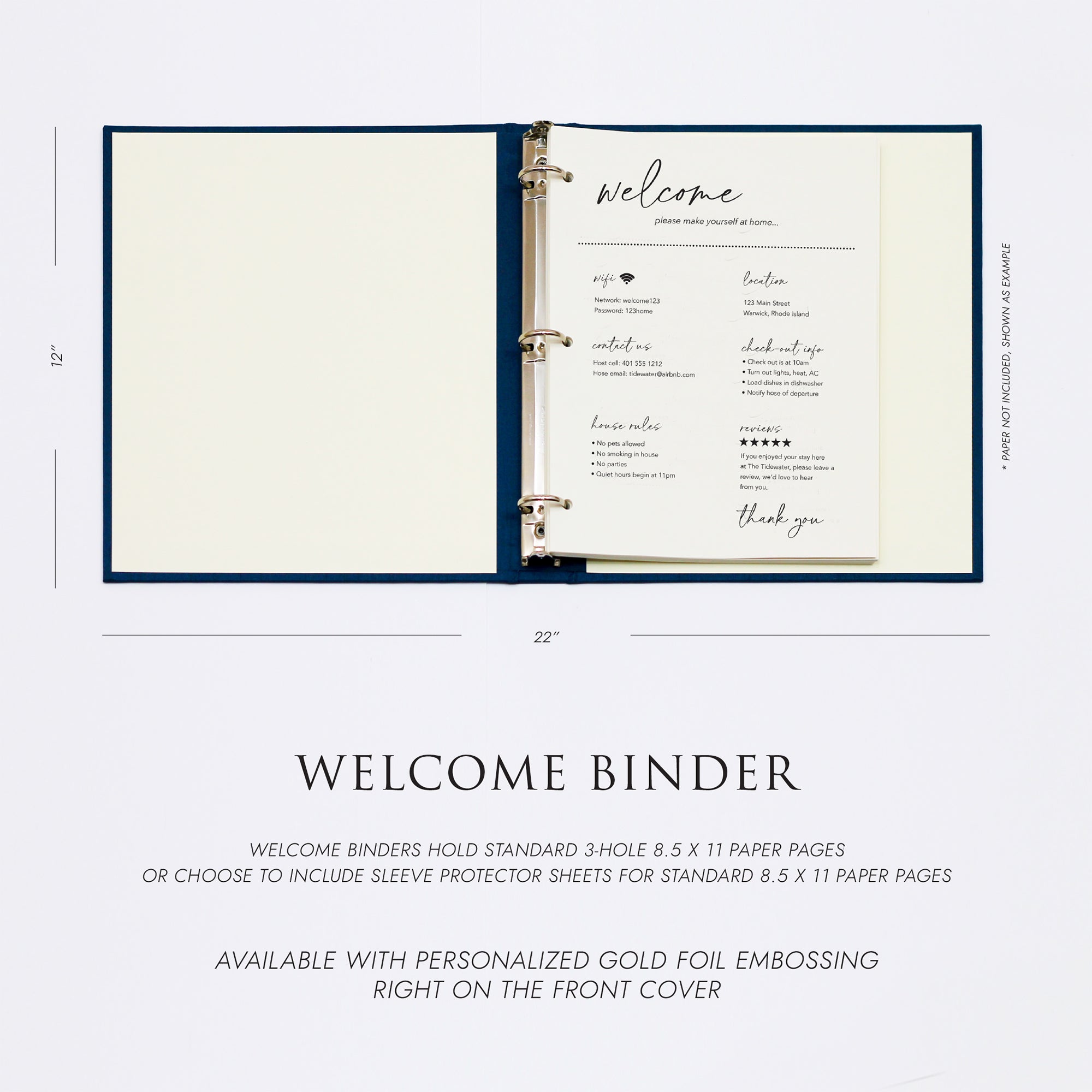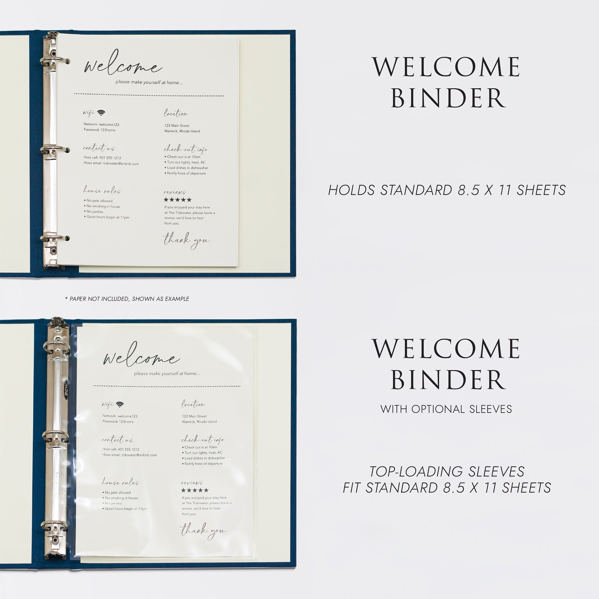 Create the perfect “welcome” for guests and friends with a Rag & Bone Bindery Welcome Binder. Great for keeping relevant documents, brochures, favorite spots, and suggestions all in one place for your rental property or vacation home. Print and store your 8.5 x 11 documents all in one place for guests and friends.