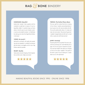 At heart, Rag & Bone Bindery is a family affair and we promise authenticity, quality, and care with every book we make. What began in 1990 as a shared interest in bookbinding and all things bookish between owners Jason Thompson & Ilira Steinman has endured for over 30 years as a unique bookbinding studio with a history rooted in fine craftsmanship and classic design. All of our Albums and Journals are bound by hand in our renovated historic mill building located in Pawtucket, Rhode Island.