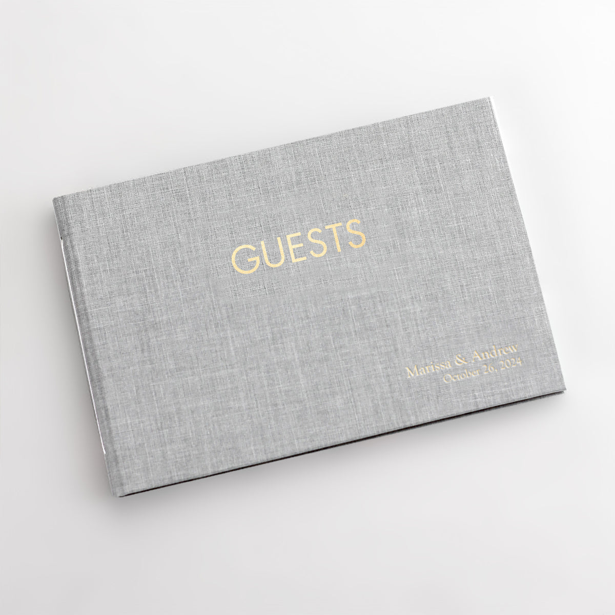 TITLE: Classic Guestbooks are available with or without a title. If you would like to include a title, simply select either click to emboss “GUESTS” as the title, which we will emboss in our 44pt Futura Font, or click to emboss your own Custom title, which we will emboss using our 30pt Futura Font, up to 20 characters.