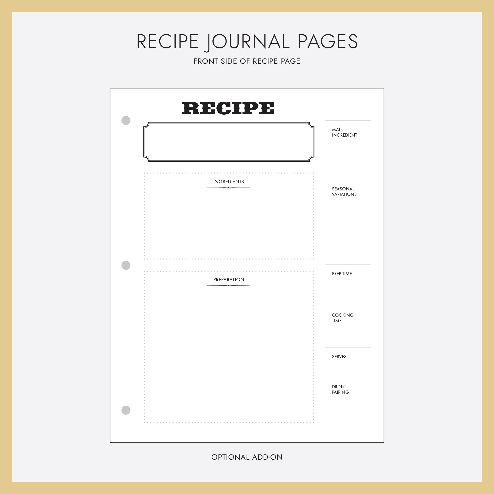ADD-ONS: Printed 8.5 x 11 recipe pages include all the basics: ingredients, preparation, cooking instructions, variations, prep time, servings and pairings as well as dates cooked, shared with, source, chef notes and room for a photo of the finished recipe. Tabs are moveable to divide sections such as appetizers, main dishes, deserts, drinks, or write your own. Top loading 8.5 x 11 archival sleeves are perfect for printed recipes from your favorite websites. Without add-ons, the Recipe Journal binder holds standard 8.5 x 11 paper pages.