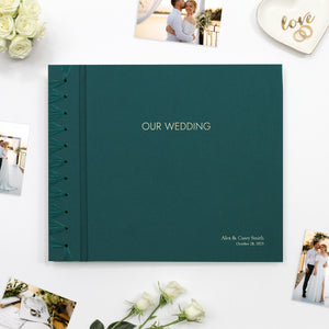 PERSONALIZATION: We can emboss a name, date, or a short message onto the front cover to add a distinctive, personal touch to your Wedding Album. The font we use is Goudy, and we can emboss one or two lines in the lower right corner, and up to 25 characters per line. See additional product images for personalization examples. The “OUR WEDDING” embossed title is featured in the front cover.