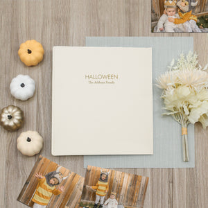 Our Halloween Albums offer a fun and unique way to store and cherish all those super cute photos of kid costumes, spooky greeting cards, and mementos for years to come. Add gold foil embossing to personalize your Halloween Album with your family name or a spooky message. Price includes HALLOWEEN gold title.