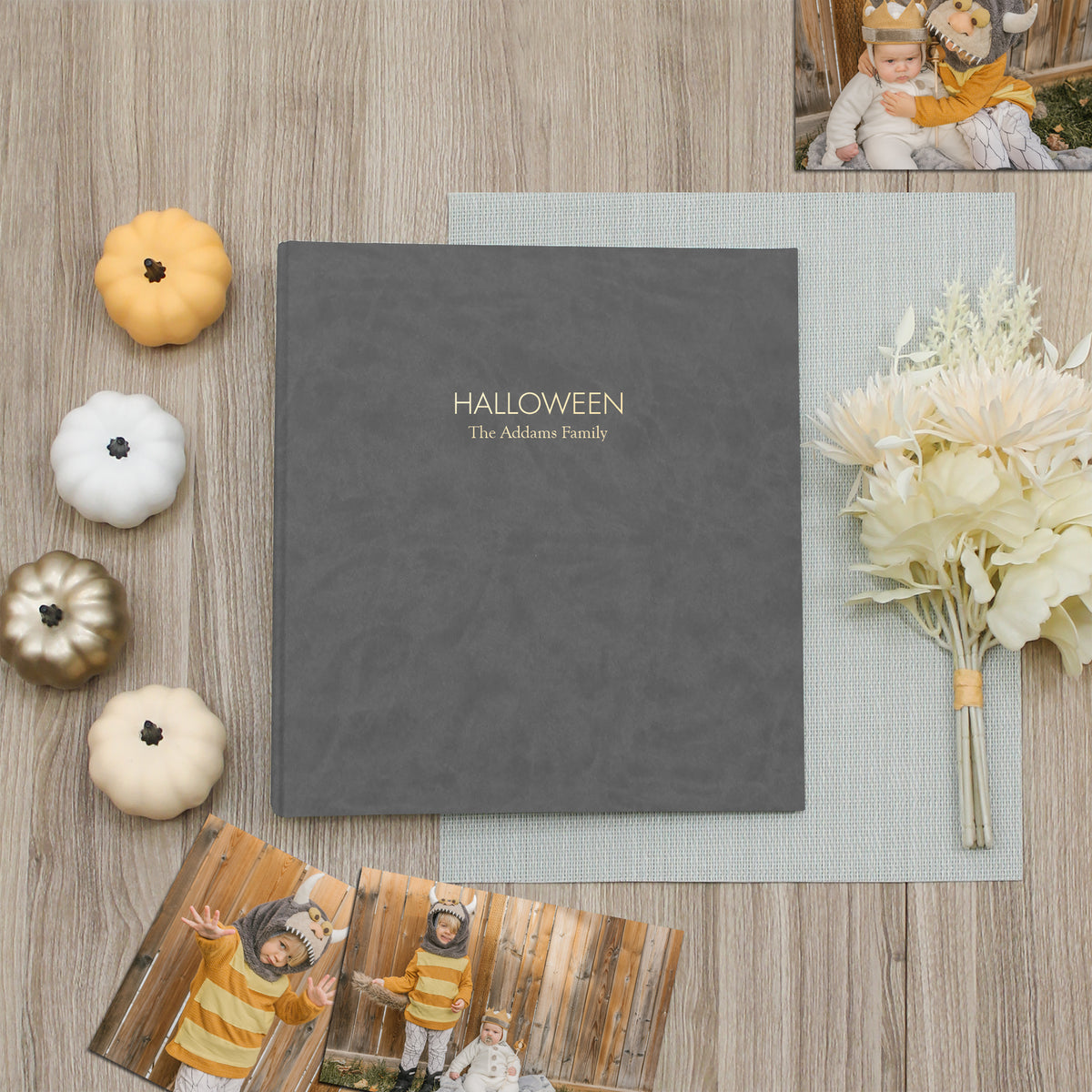 Our Halloween Albums offer a fun and unique way to store and cherish all those super cute photos of kid costumes, spooky greeting cards, and mementos for years to come. Add gold foil embossing to personalize your Halloween Album with your family name or a spooky message. Price includes HALLOWEEN gold title.