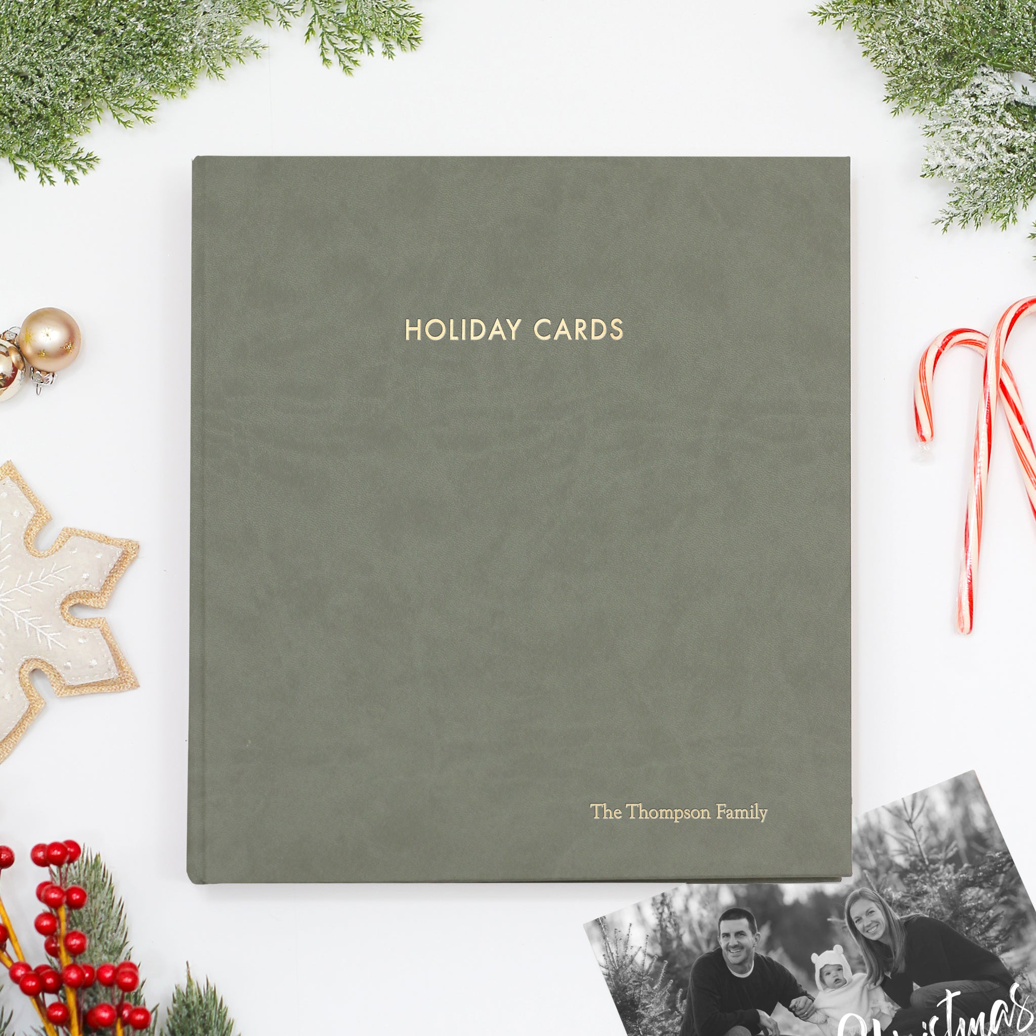 Holiday Card Album | Cover: Moss Vegan Leather | Embossed with “Holiday Cards” | Available Personalized
