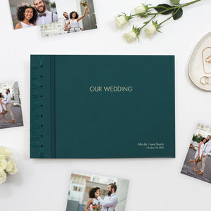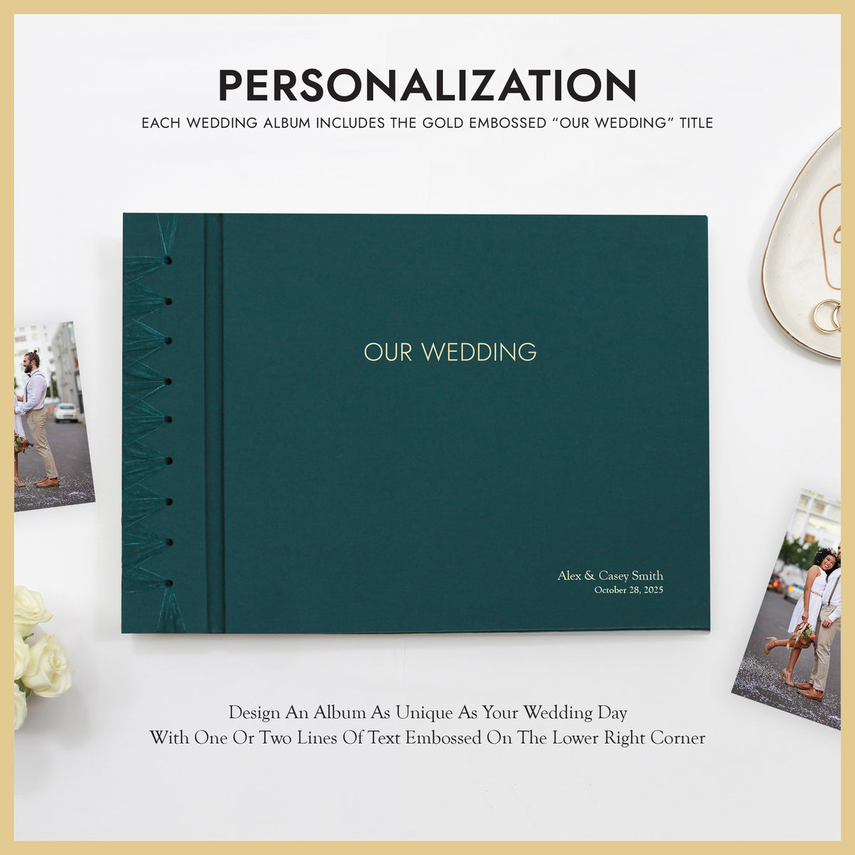 PERSONALIZATION: We can emboss a name, date, or a short message onto the front cover to add a distinctive, personal touch to your Wedding Album. The font we use is Goudy, and we can emboss one or two lines in the lower right corner, and up to 25 characters per line. See additional product images for personalization examples. The “OUR WEDDING” embossed title is featured in the front cover.
