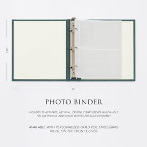 PERSONALIZATION: Add a distinctive touch to your Photo Binder with custom embossing. We can emboss a name, date, event, or short message (up to 25 characters per line) on the front cover in our classic Goudy font. See additional product images for examples. Just enter your desired text in the "Click To Emboss..." fields, and we'll take care of the rest. The gold embossed "PHOTOS" title on the front cover is optional.
