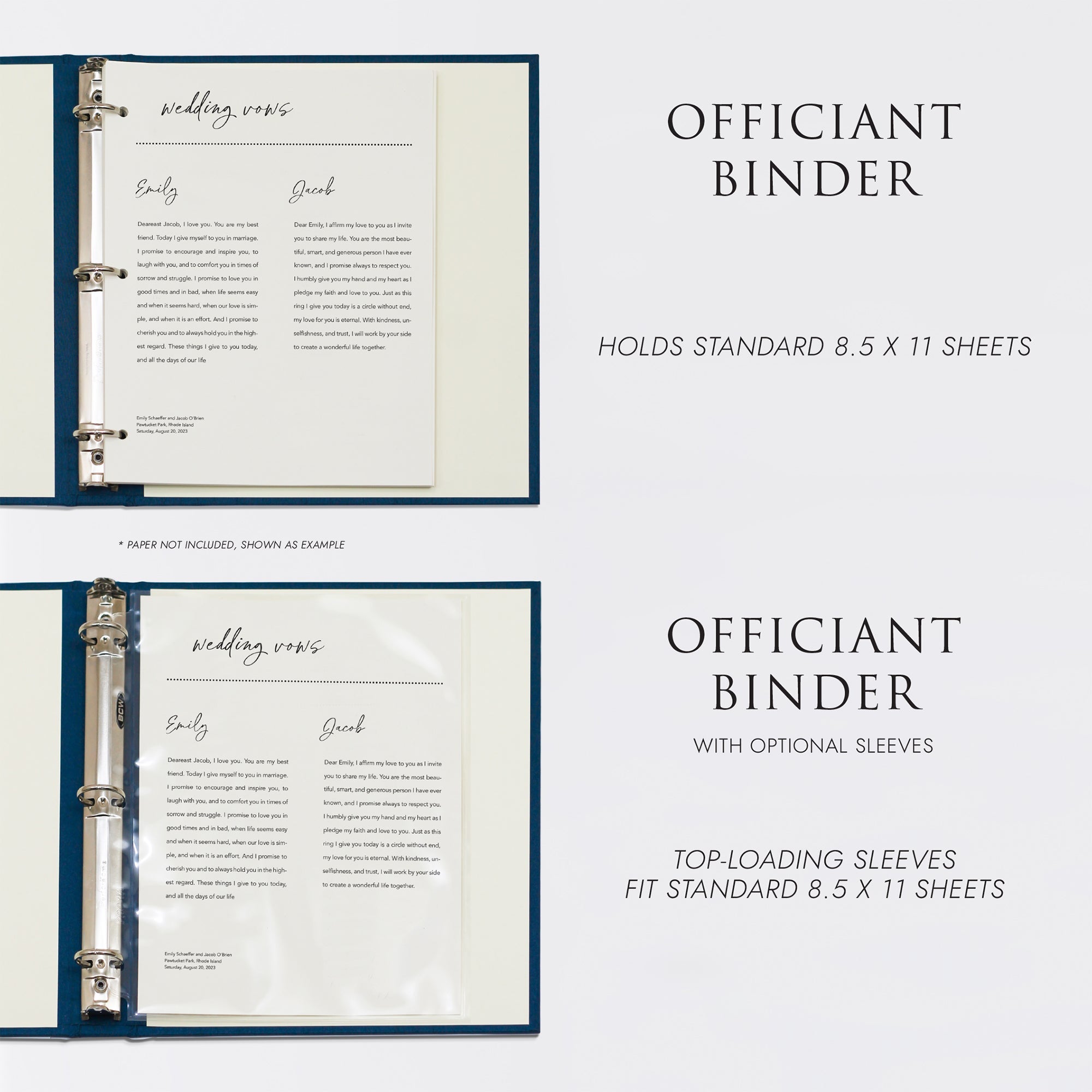 EMBOSSING: Let us emboss names, wedding date, or short message right on the front cover to add a distinctive touch to your Officiant Binder. The font we use is Goudy, and we can emboss up to 25 characters per line. See additional product images for embossing example.