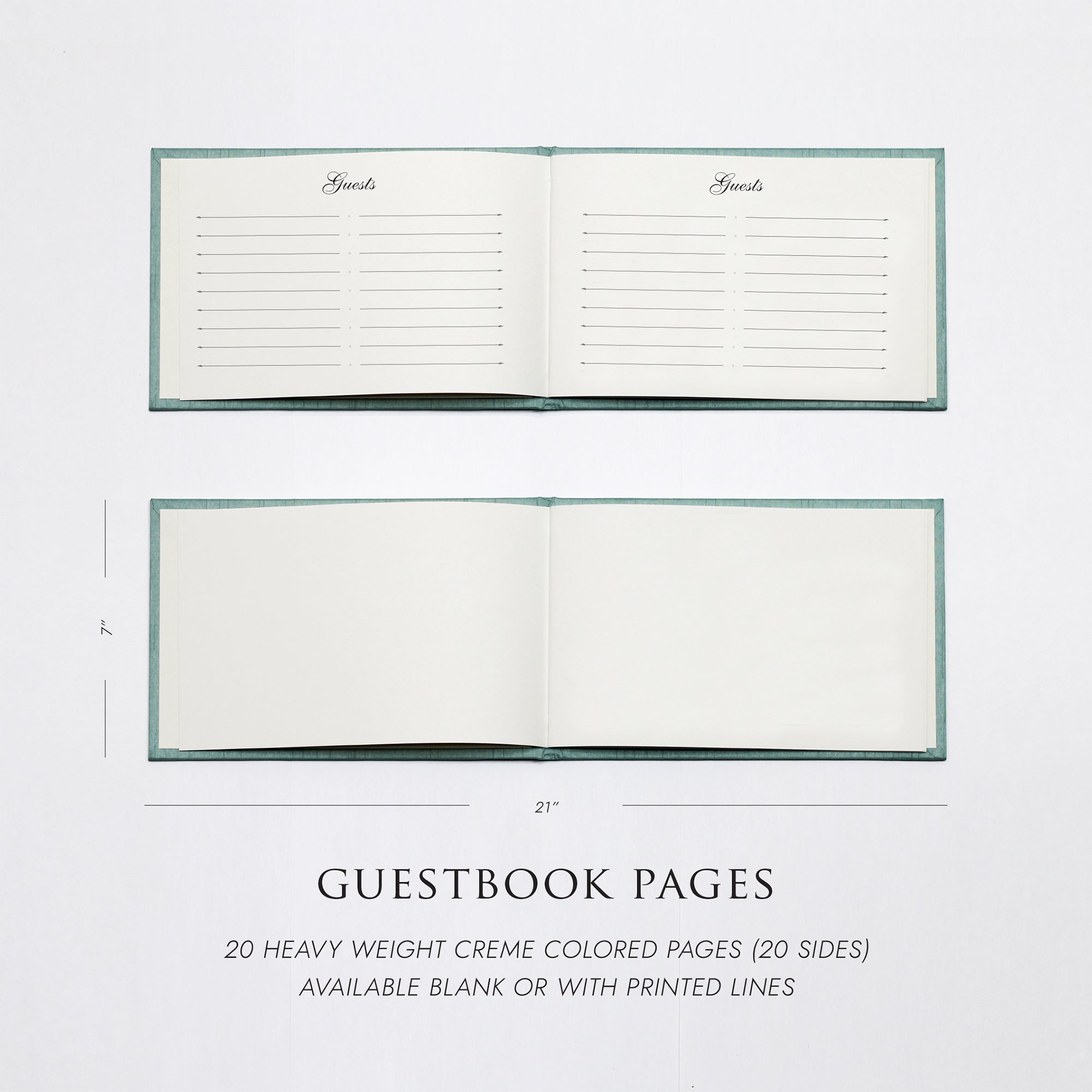 INSIDE: Twenty acid-free, creme colored pages, which are available with either printed lines (enough for 360 guests) or with blank pages.