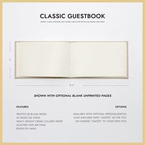 INSIDE: Twenty acid-free, creme colored pages, which are available with either printed lines (enough for 360 guests) or with blank pages.