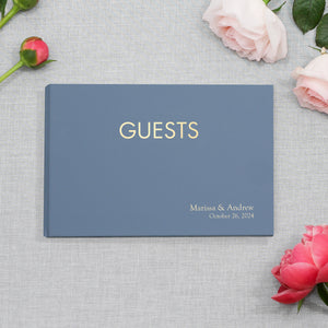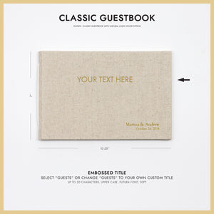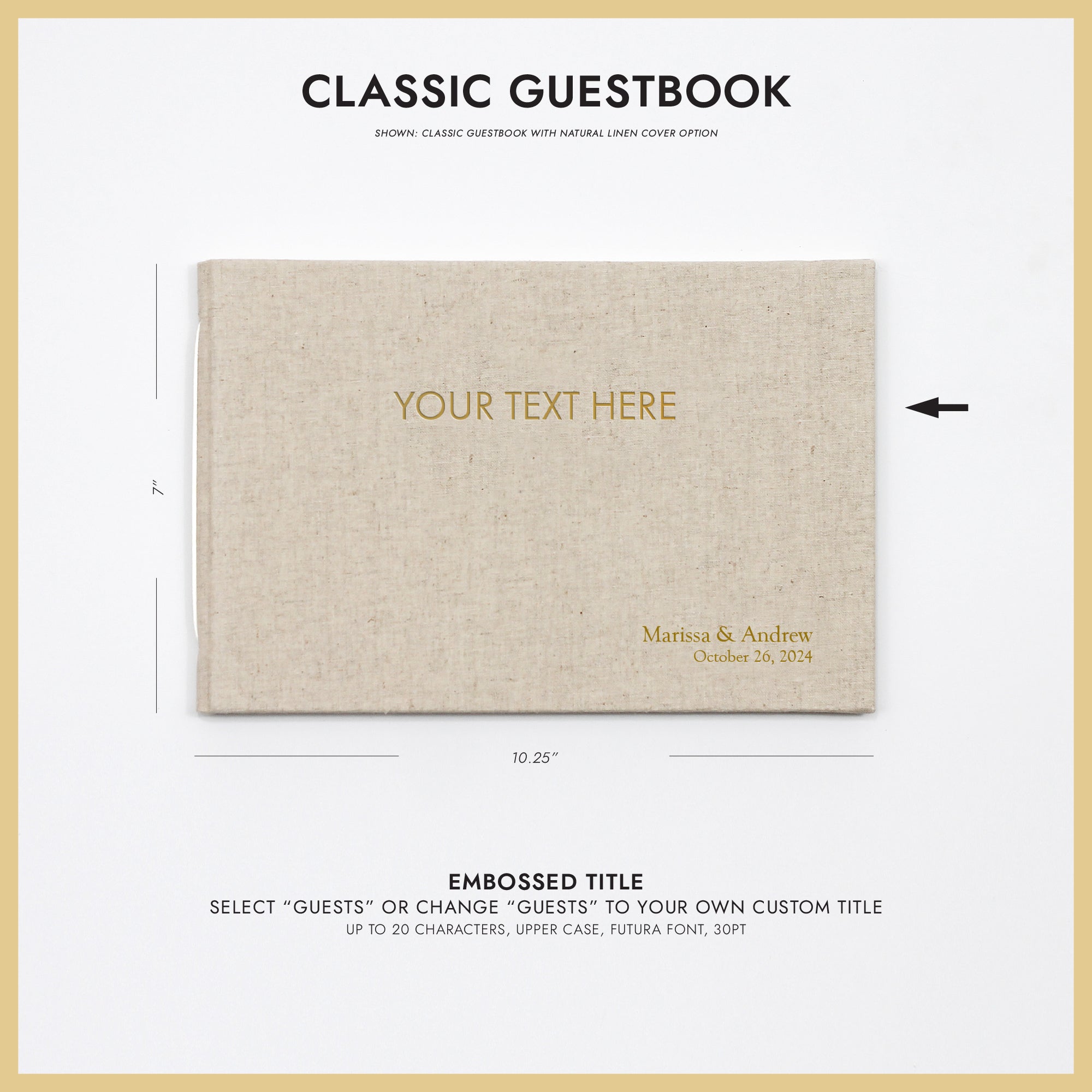 TITLE: Classic Guestbooks are available with or without a title. If you would like to include a title, simply select either click to emboss “GUESTS” as the title, which we will emboss in our 44pt Futura Font, or click to emboss your own Custom title, which we will emboss using our 30pt Futura Font, up to 20 characters.