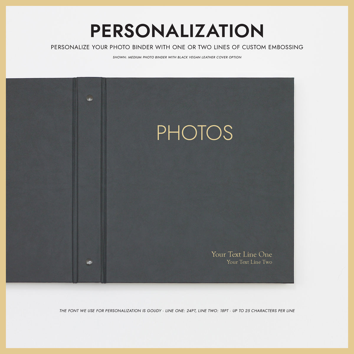 PERSONALIZATION: Add a distinctive touch to your Photo Binder with custom embossing. We can emboss a name, date, event, or short message (up to 25 characters per line) on the front cover in our classic Goudy font. See additional product images for examples. Just enter your desired text in the "Click To Emboss..." fields, and we'll take care of the rest. The gold embossed "PHOTOS" title on the front cover is optional.