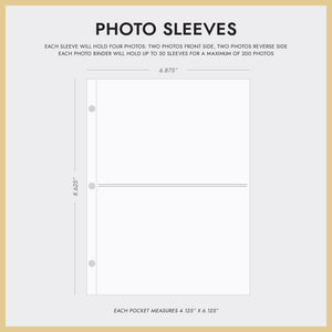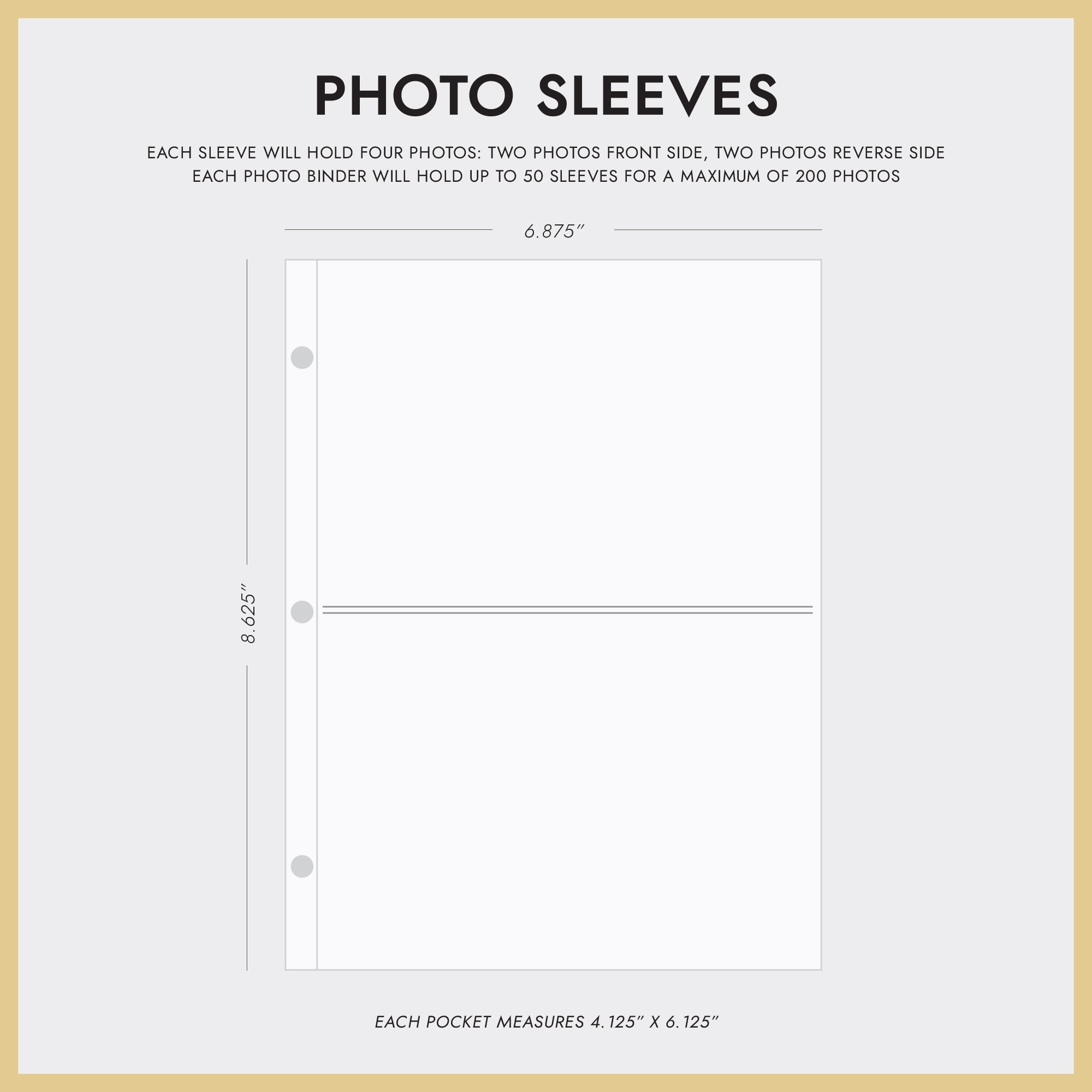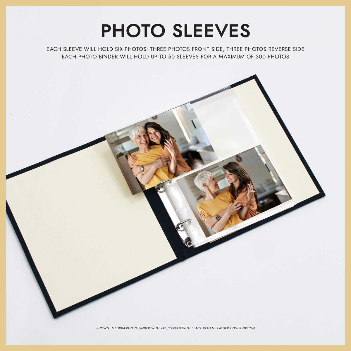 INSIDE: Photo Binders include clear sleeves, each designed to hold four 4x6 photos. Select the 25 sleeve option for 100 photos or the 50 sleeve option to accommodate up to 200 photos. Large 4x6 Photo Binders hold a maximum of 200 photos.