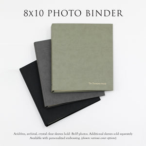 INSIDE: Photo Binders include clear sleeves, each designed to hold two 8x10 photos. Select the 25 sleeve option for 50 photos or the 50 sleeve option to accommodate up to 100 photos. Large 8x10 Photo Binders hold a maximum of 100 photos.