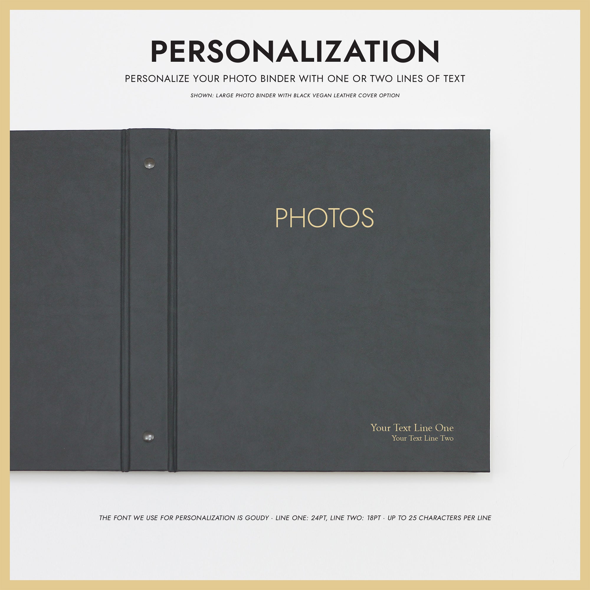 PERSONALIZATION: Add a distinctive touch to your Photo Binder with custom embossing. We can emboss a name, date, event, or short message (up to 25 characters per line) on the front cover in our classic Goudy font. See additional product images for examples. Just enter your desired text in the "Click To Emboss..." fields, and we'll take care of the rest. The gold embossed "PHOTOS" title on the front cover is optional.