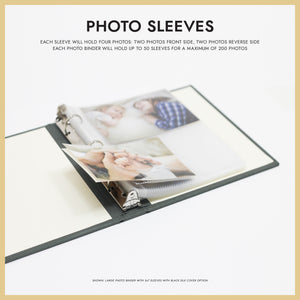 INSIDE: Photo Binders include clear sleeves, each designed to hold four 5x7 photos. Select the 25 sleeve option for 100 photos or the 50 sleeve option to accommodate up to 200 photos. Large 5x7 Photo Binders hold a maximum of 200 photos.