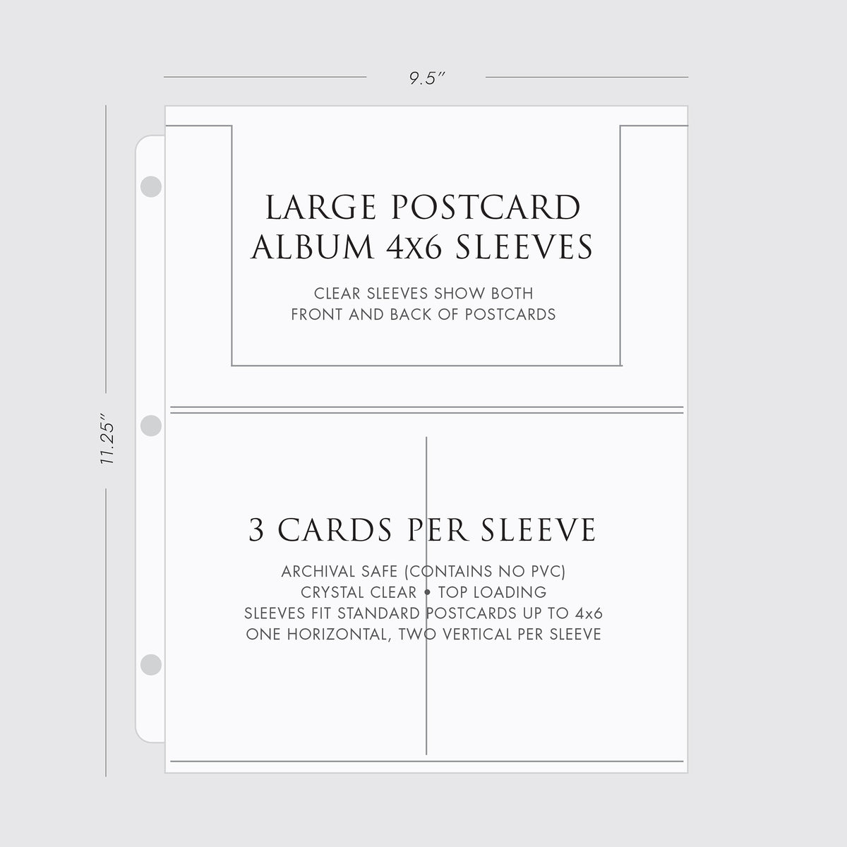 INSIDE: Choose either 4x6 sleeves: 3 cards per sleeve (showing front and back, vertical and horizontal orientation); or 5x7 sleeves: 2 cards per sleeve (showing front and back, horizontal orientation). See gallery for sleeve examples. Sleeves are transparent and show both sides of postcards.