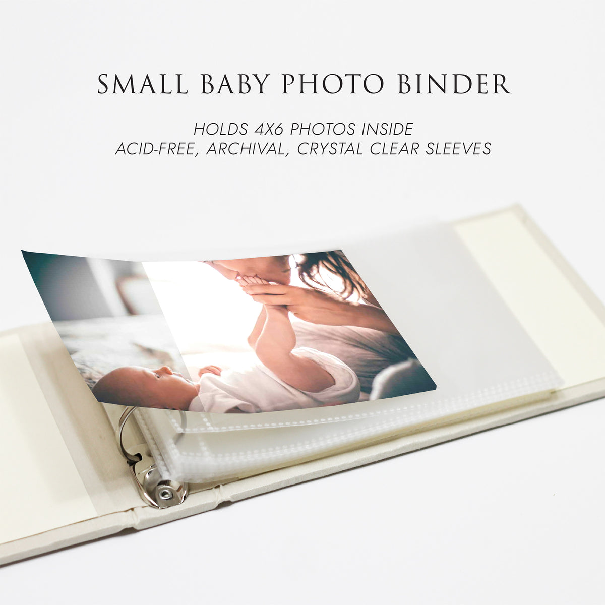 INSIDE: Each Small Baby Photo Binder will hold up to 50 photos inside 25 crystal clear sleeves, or select the 100 photo capacity for a Baby Photo Binder with 50 sleeves.