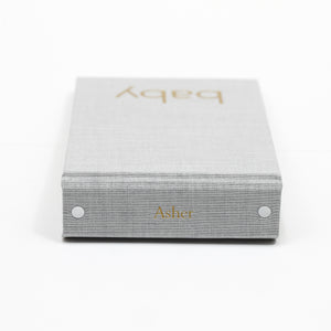 SPINE EMBOSSING: Let us emboss baby's name right on the spine of your Small Baby Photo Binder. The font we use is Goudy, and we can emboss up to 25 characters. See additional product images for embossing examples.