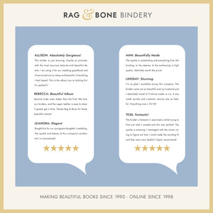 The Rag & Bone Bindery Wedding Card Album is a timeless keepsake designed to protect and beautifully display the treasured cards you receive at your wedding for generations to come. More than just an album, it's a way to relive the joy and well wishes of your special day. Makes a great gift for the happy couple!