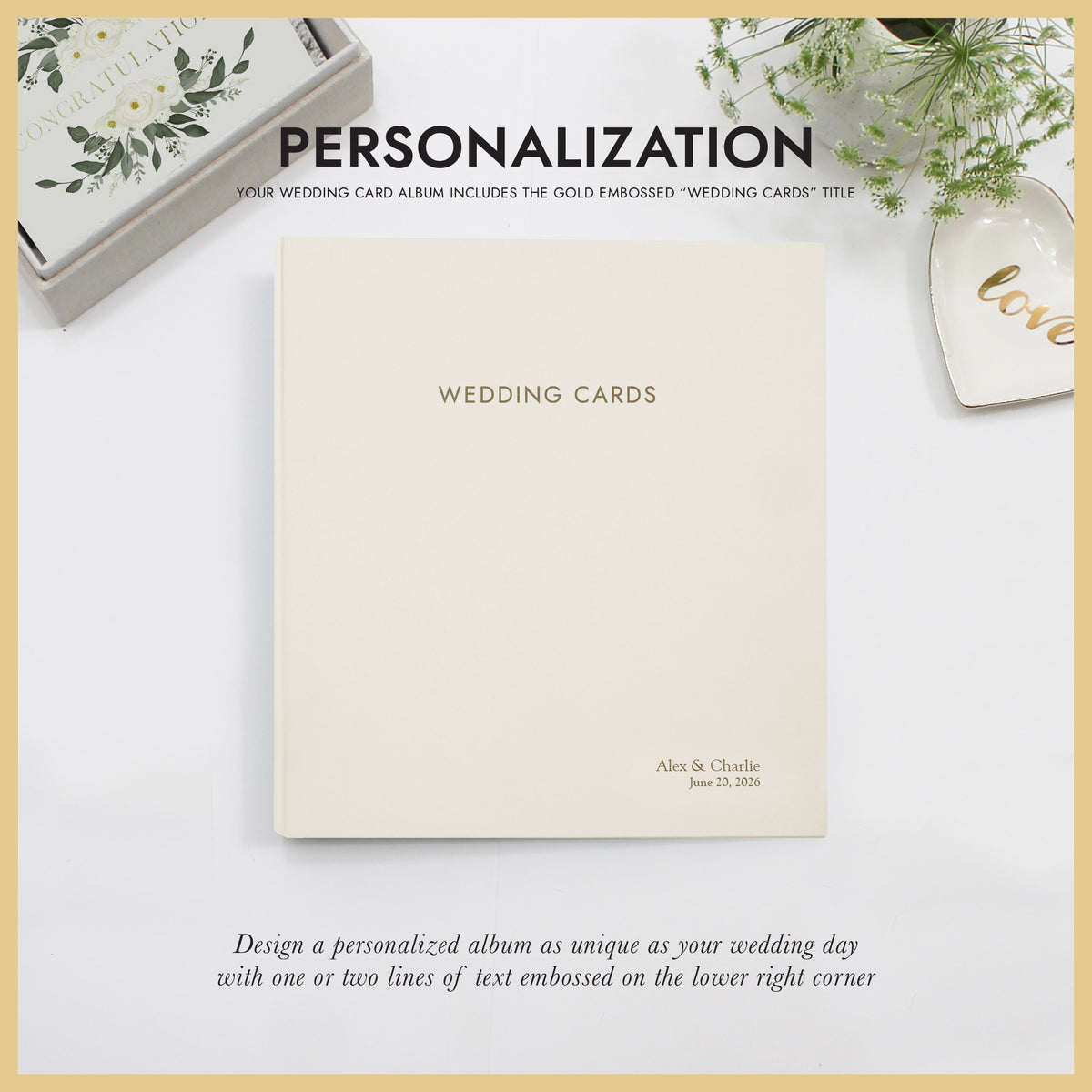 EMBOSSING: Add a personal touch with custom embossing. Include the couple's names, wedding date, or a special message, with one or two lines of custom text, up to 25 characters per line, in our elegant Goudy font. See product images for embossing examples.