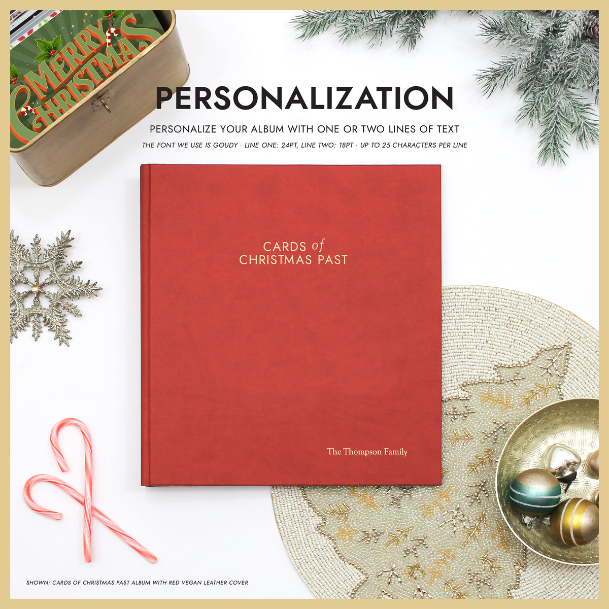 EMBOSSING: Let us emboss a family name, date, or short message right on the front cover to add a distinctive touch to your Cards of Christmas Past Album. The font we use is Goudy, and we can emboss up to 25 characters per line. See additional product image for embossing examples.