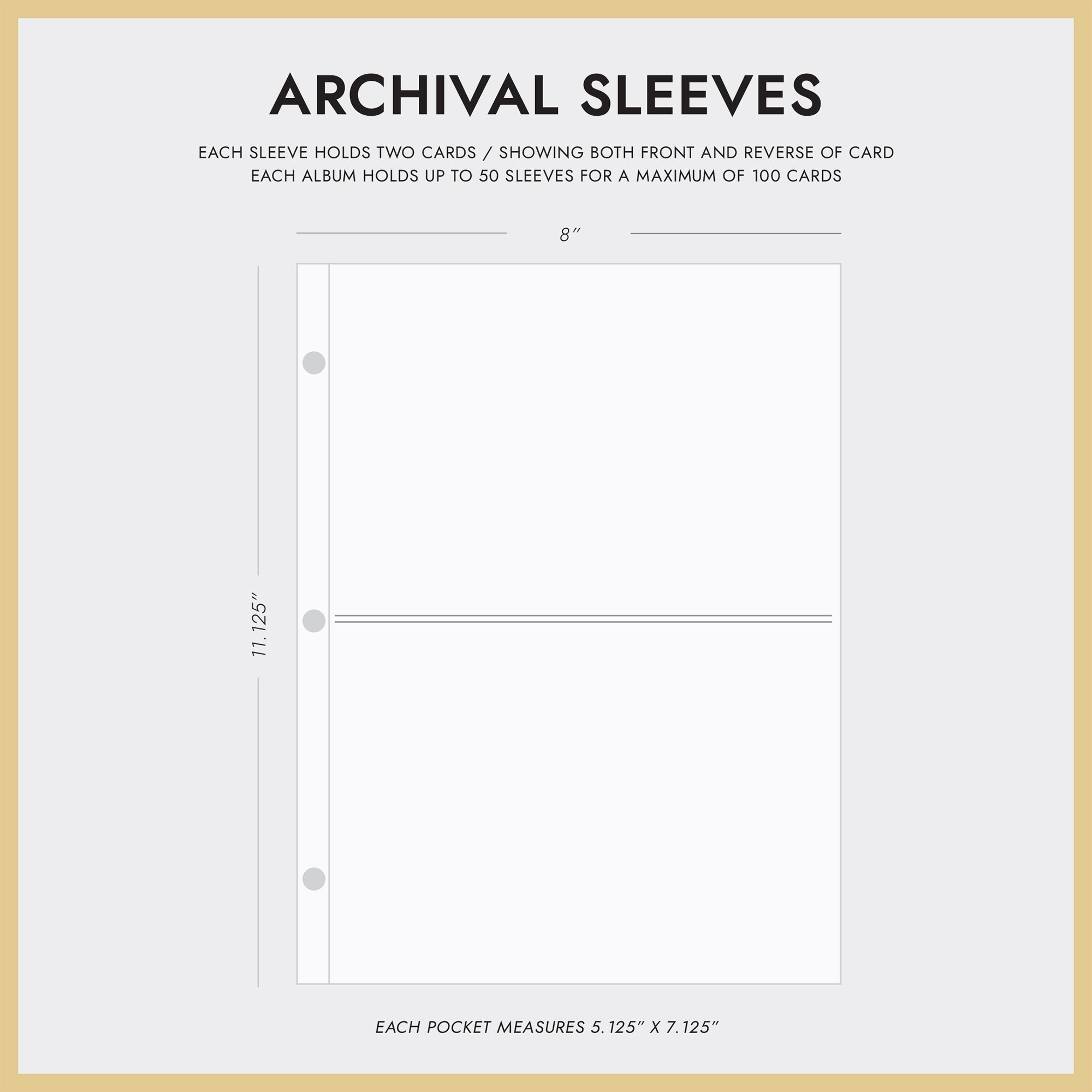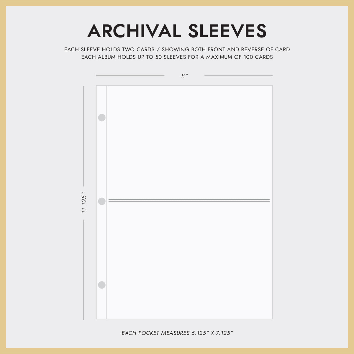 INSIDE: Each album will hold and store up to 50 cards inside 25 crystal clear sleeves, or select the 50 sleeves for 100 cards. Sleeves hold cards up to 5x7.