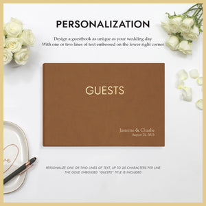 PERSONALIZATION: Personalize your Guestbook with names, a wedding date, or a special message embossed on the lower right corner of the cover. We use the classic Goudy font, and can emboss up to 25 characters per line. See product images for examples.