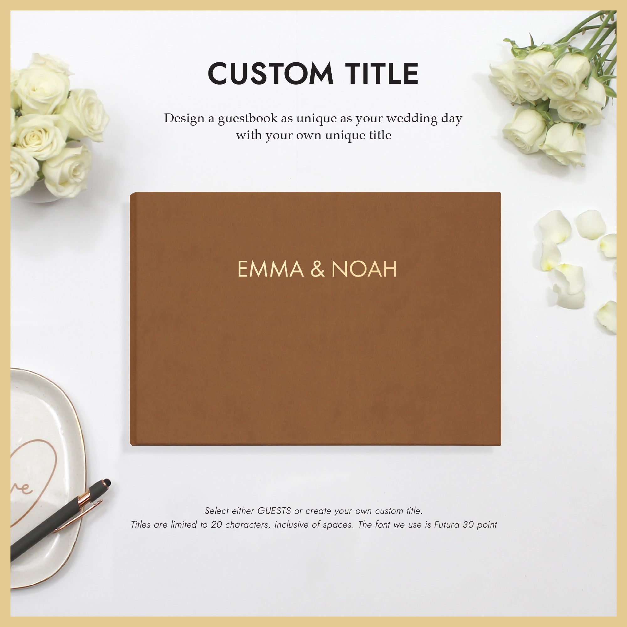 TITLE: Your Guestbook includes "GUESTS" embossed on the front cover, or we can replace "GUESTS" with your custom title. Custom titles are limited to 20 characters, and the font we use is Futura. See product images for more details.