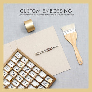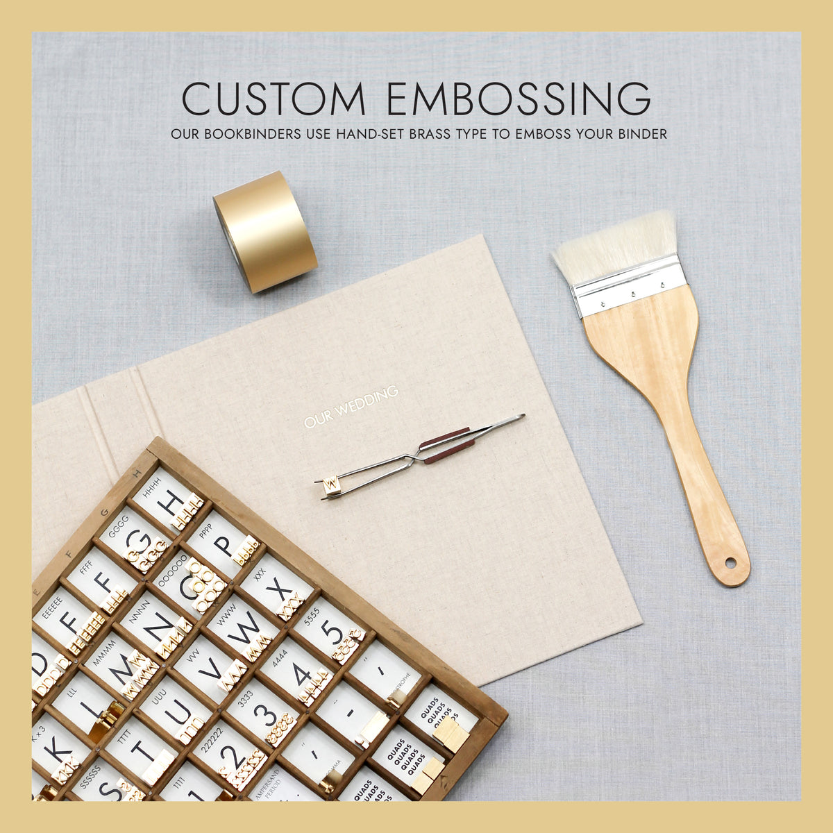 CUSTOM EMBOSSING: Emboss a name, date, phrase or short message up to 20 characters including spaces as the title on the cover. The font for the title is Futura and will be set in all Upper case characters. See images for examples.