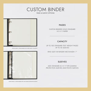 INSIDE: Custom Binders are available with optional sleeves for photos or documents. Select the sleeve options that work best for your project. All of our sleeves are PVC and acid free. Custom Binders can hold up to 100 standard weight 8.5 x 11 paper pages, or up to 50 sleeves maximum. [paper not included]