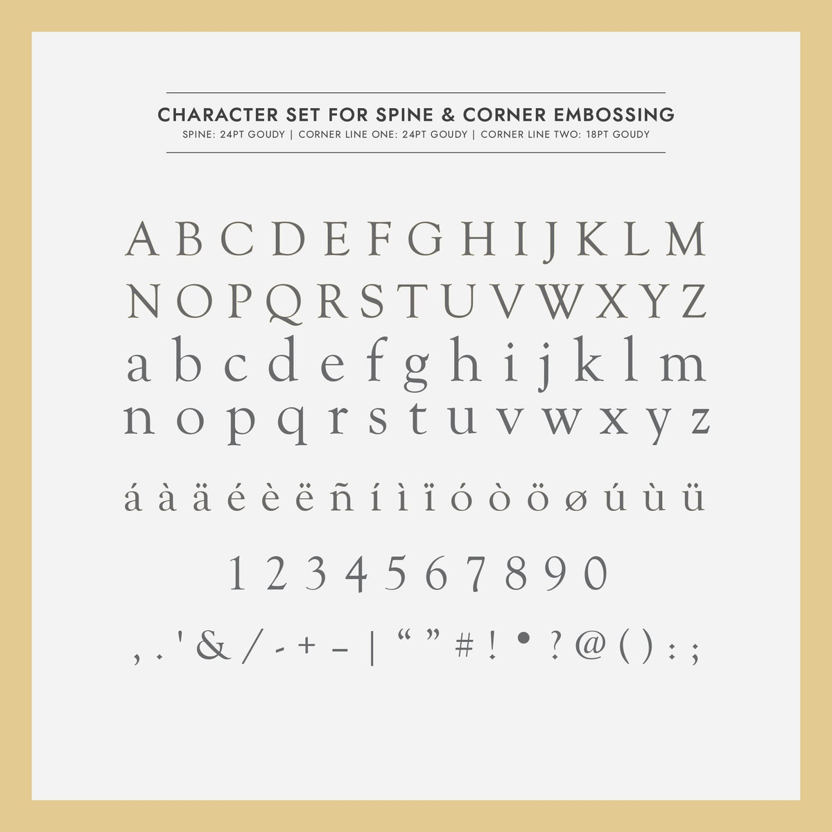 • SPINE: Up to 25 characters, Upper and Lower case, Goudy font, 24pt