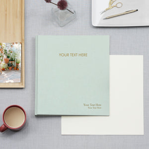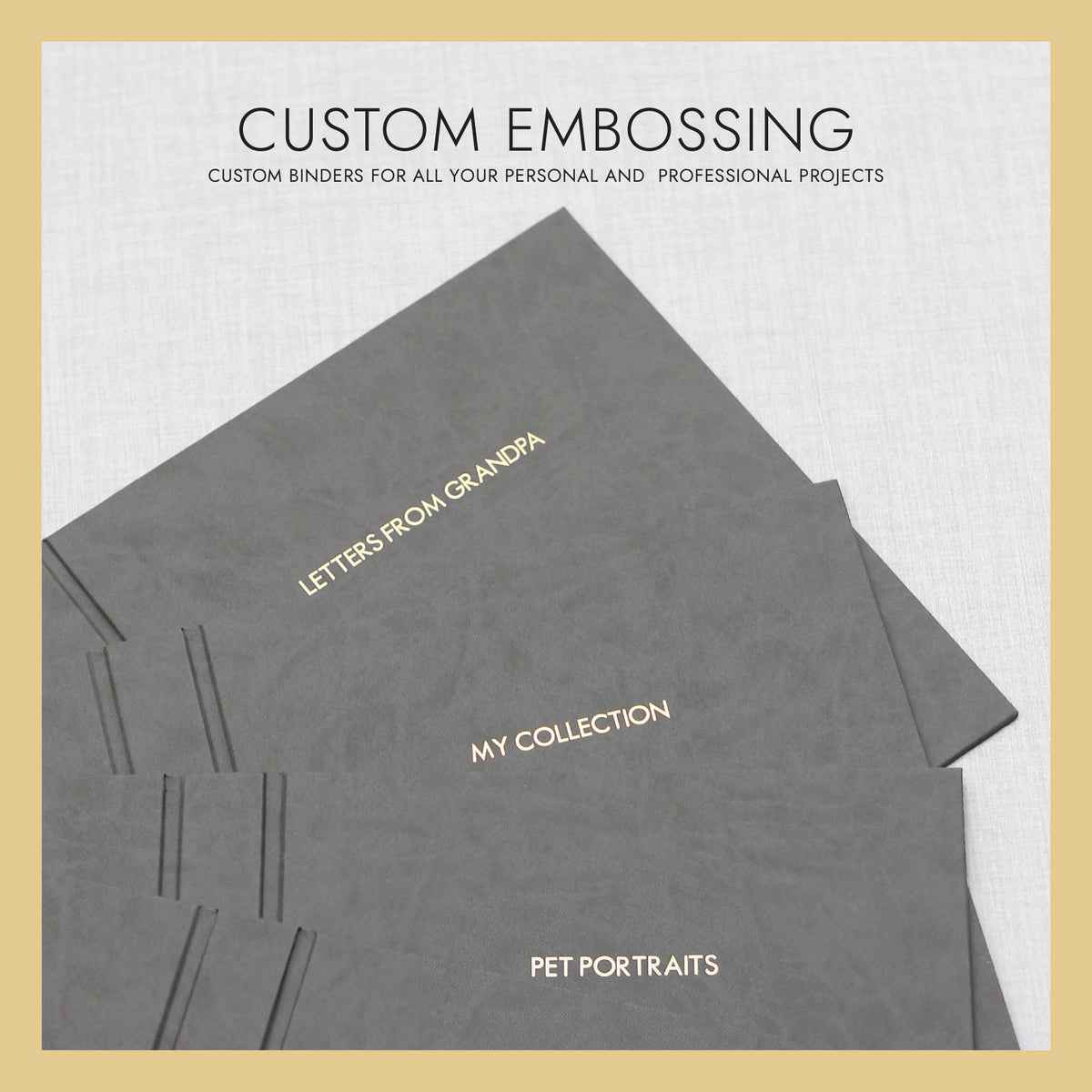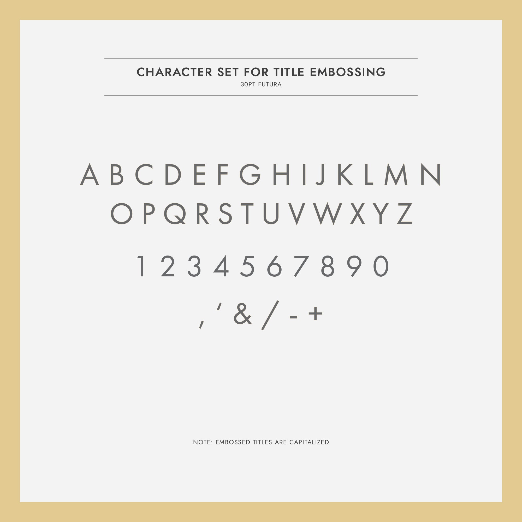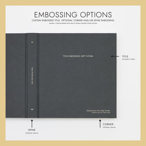 CUSTOM EMBOSSING: Emboss a name, date, phrase or short message up to 20 characters including spaces as the title on the cover. The font for the title is Futura and will be set in all Upper case characters. See images for examples.