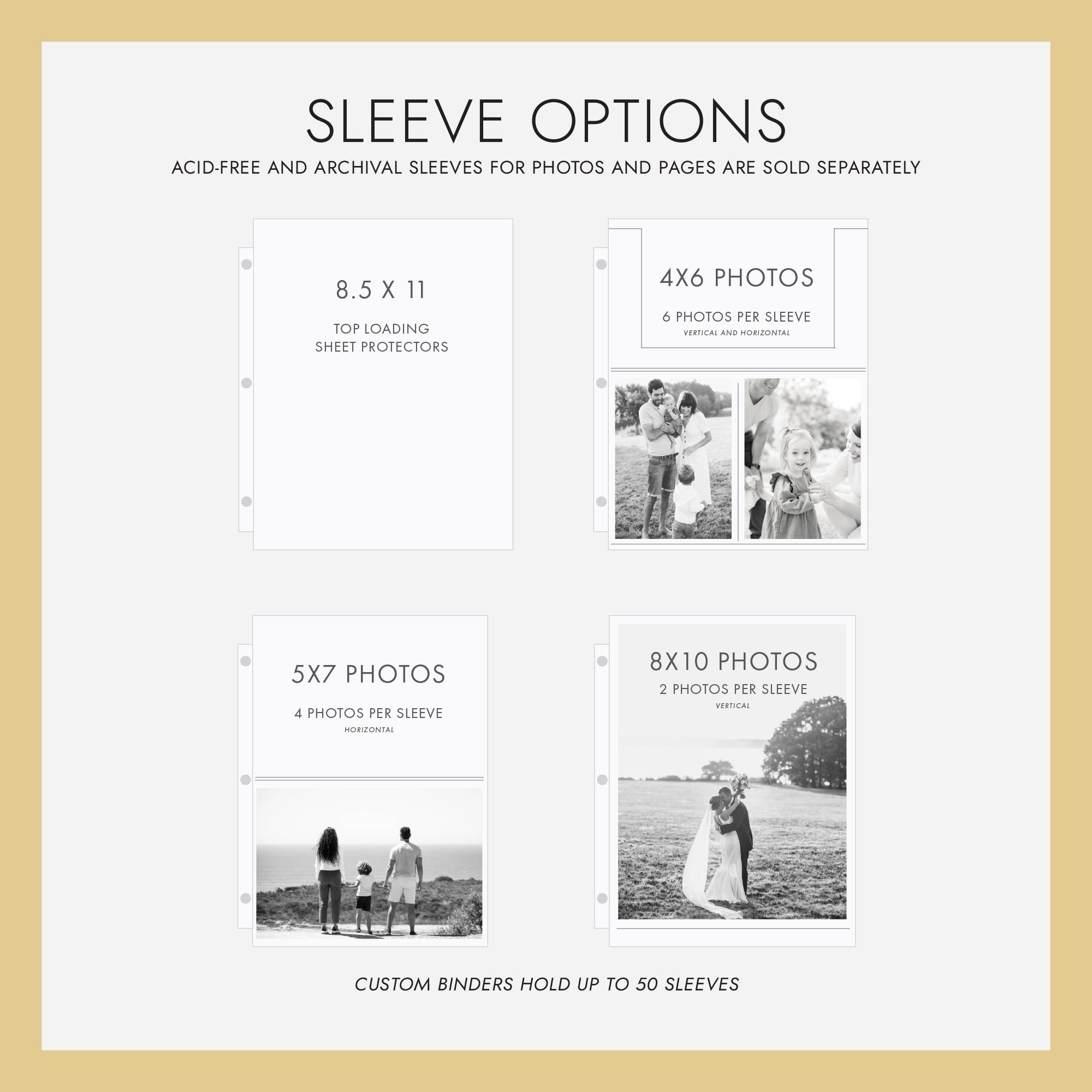 INSIDE: Custom Binders are available with optional sleeves for photos or documents. Select the sleeve options that work best for your project. All of our sleeves are PVC and acid free. Custom Binders can hold up to 100 standard weight 8.5 x 11 paper pages, or up to 50 sleeves maximum. [paper not included]