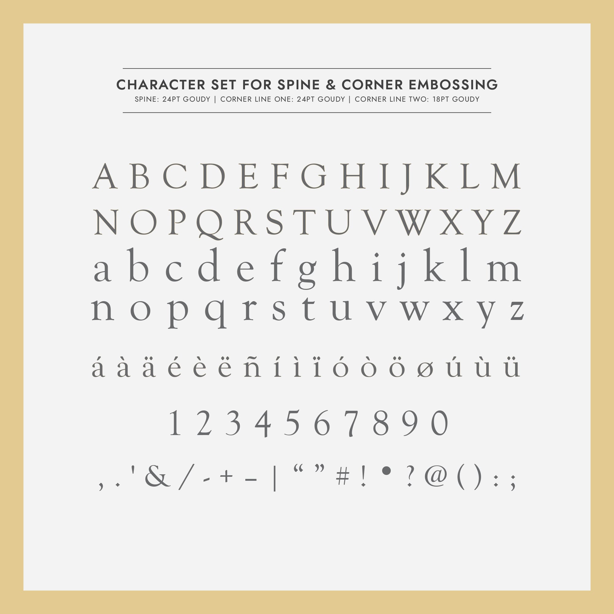 • SPINE: Up to 25 characters, Upper and Lower case, Goudy font, 24pt
