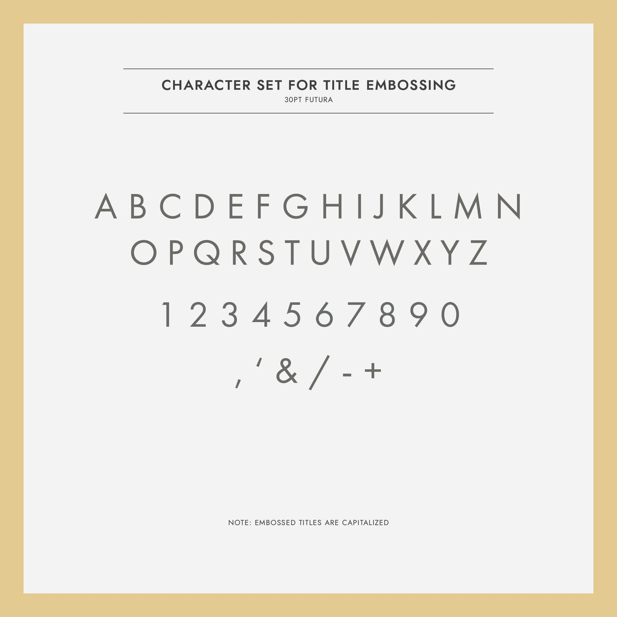 CUSTOM EMBOSSING: Emboss a name, date, phrase or short message up to 20 characters including spaces as the title on the cover. The font for the title is Futura and will be set in all Upper case characters. See images for examples.