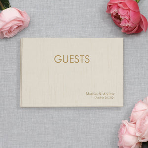 TITLE: Classic Guestbooks are available with or without a title. If you would like to include a title, simply select either click to emboss “GUESTS” as the title, which we will emboss in our 44pt Futura Font, or click to emboss your own Custom title, which we will emboss using our 30pt Futura Font, up to 20 characters.