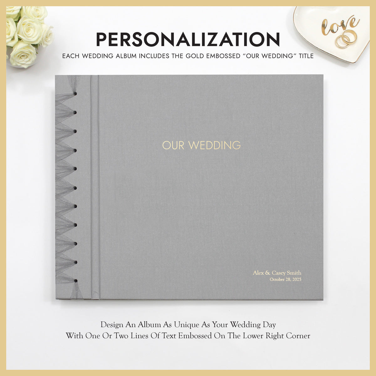 PERSONALIZATION: We can emboss a name, date, or a short message onto the front cover to add a distinctive, personal touch to your Wedding Album. The font we use is Goudy, and we can emboss one or two lines in the lower right corner, and up to 25 characters per line. See additional product images for personalization examples. The “OUR WEDDING” embossed title is featured in the front cover.