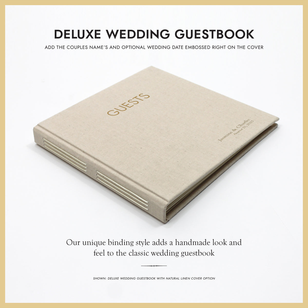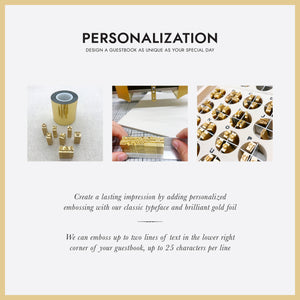 PERSONALIZATION OPTIONS: Make your guestbook truly unique with our embossing options. Select the "GUESTS" title, or customize the title to reflect your event - we can emboss up to 20 characters for a custom title. Additionally, we can add names, and an optional wedding date, or other message, to the cover's lower right corner. We use the elegant Goudy font, with a maximum of 25 characters per line, to create a beautiful, lasting impression. Please refer to the product images for examples.
