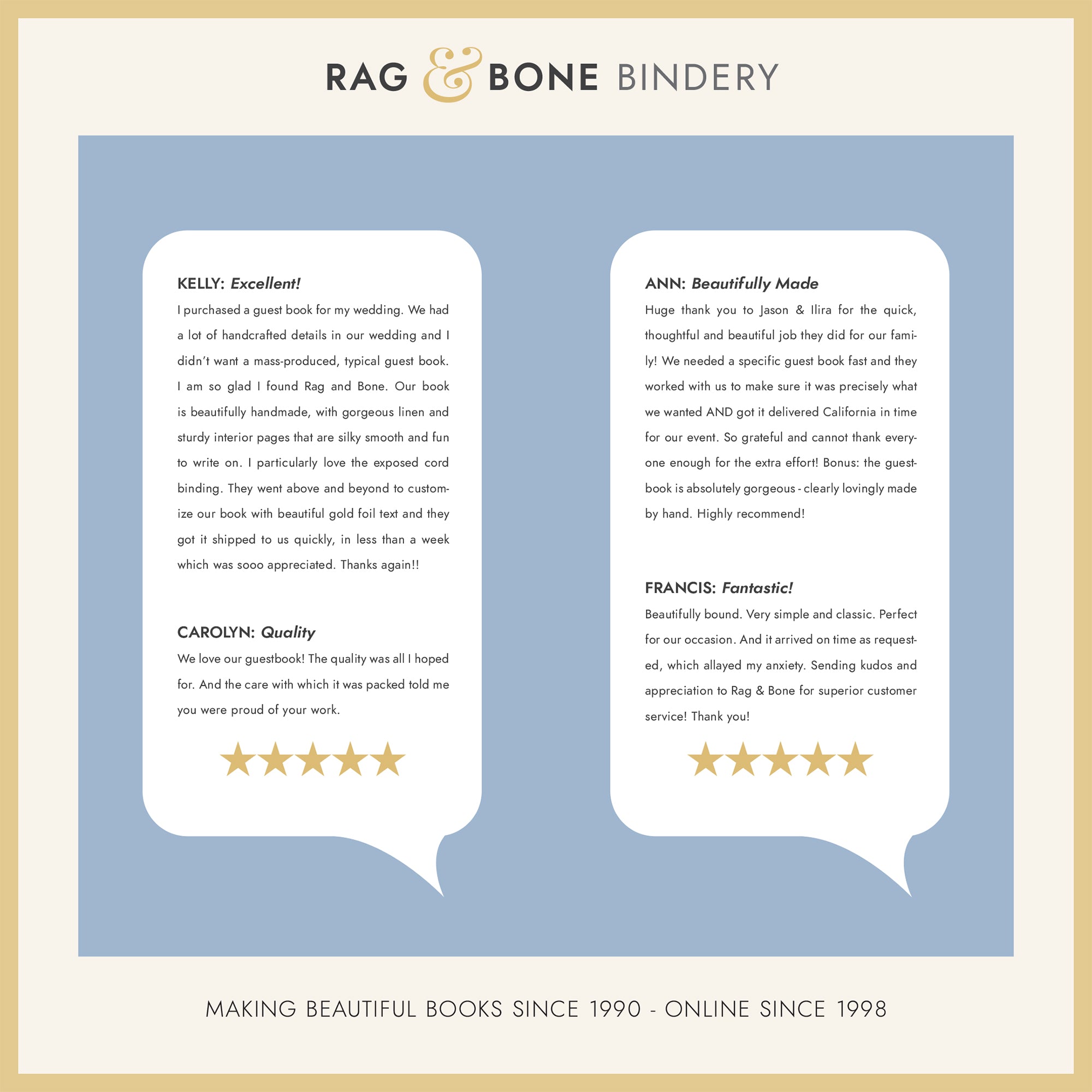 At heart, Rag & Bone Bindery is a family affair and we promise authenticity, quality, and care with every book we make. What began in 1990 as a shared interest in bookbinding and all things bookish between owners Jason Thompson & Ilira Steinman has endured for over 30 years as a unique bookbinding studio with a history rooted in fine craftsmanship and classic design. All of our Albums and Journals are bound by hand in our renovated historic mill building located in Pawtucket, Rhode Island.