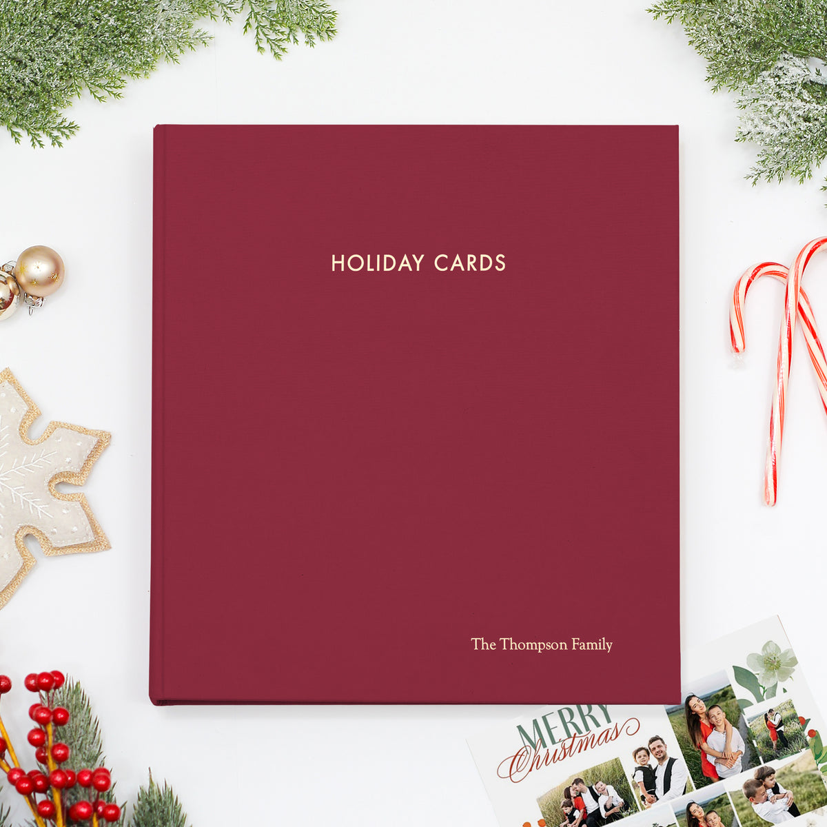 Holiday Card Album | Cover: Cranberry Red Cotton | Embossed with “Holiday Cards” | Available Personalized
