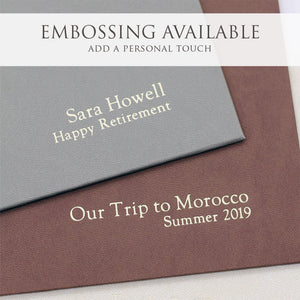 EMBOSSING: Let us emboss a name, date, event, or a short message onto the front cover to add a distinctive touch to your Album. The font we use is Goudy, and we can emboss up to 25 characters per line. See additional product images for embossing examples.