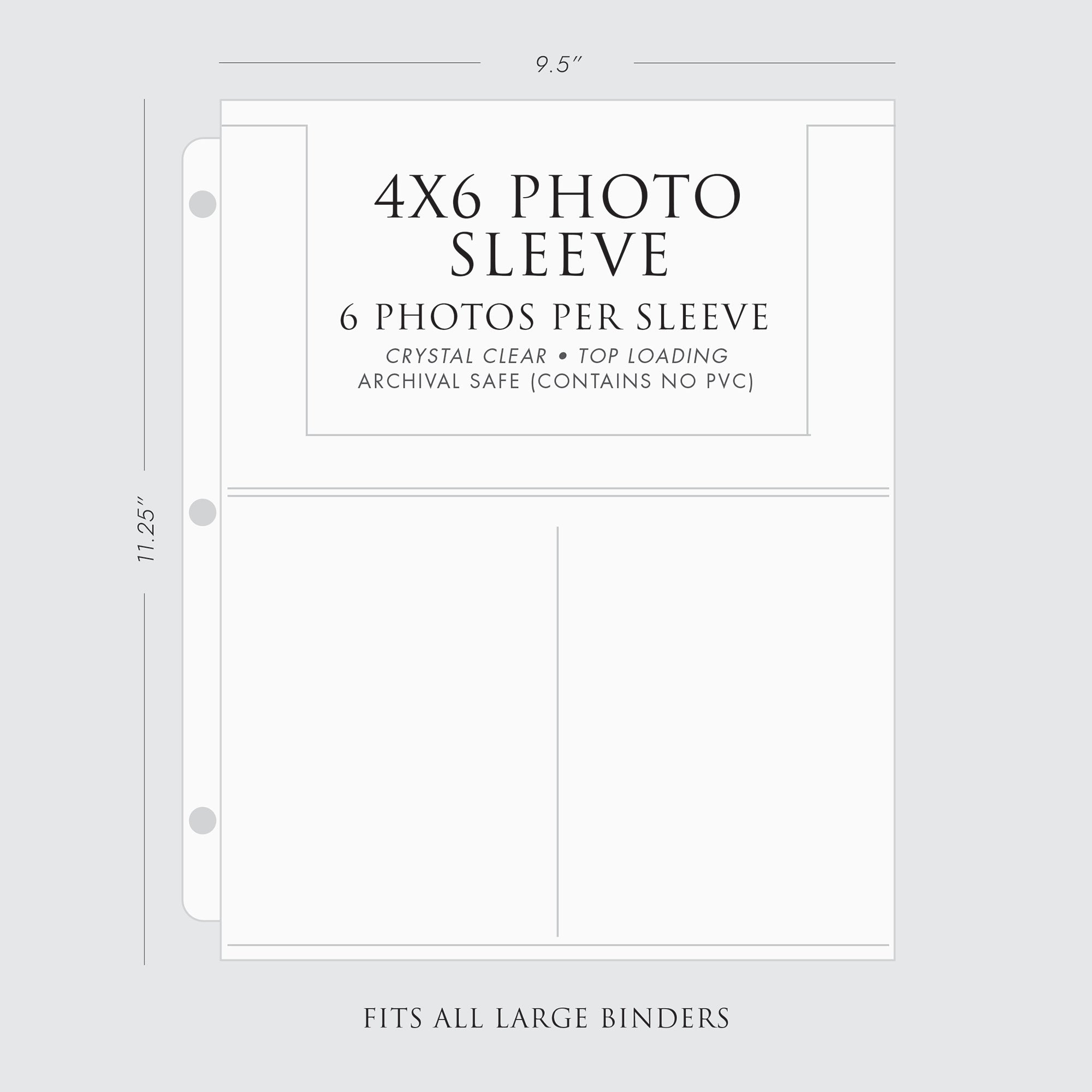 INSIDE: Photo Binders include clear sleeves, each designed to hold six 4x6 photos. Each sleeve offers versatile storage with slots for both horizontal and vertical photos. Select the 25 sleeve option for 150 photos or the 50 sleeve option to accommodate up to 300 photos. Large 4x6 Photo Binders hold a maximum of 300 photos.