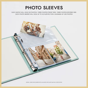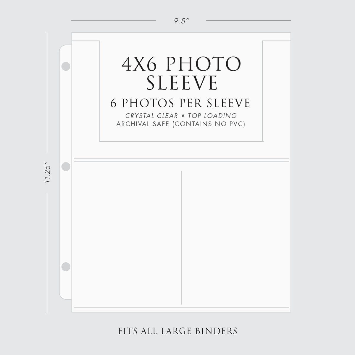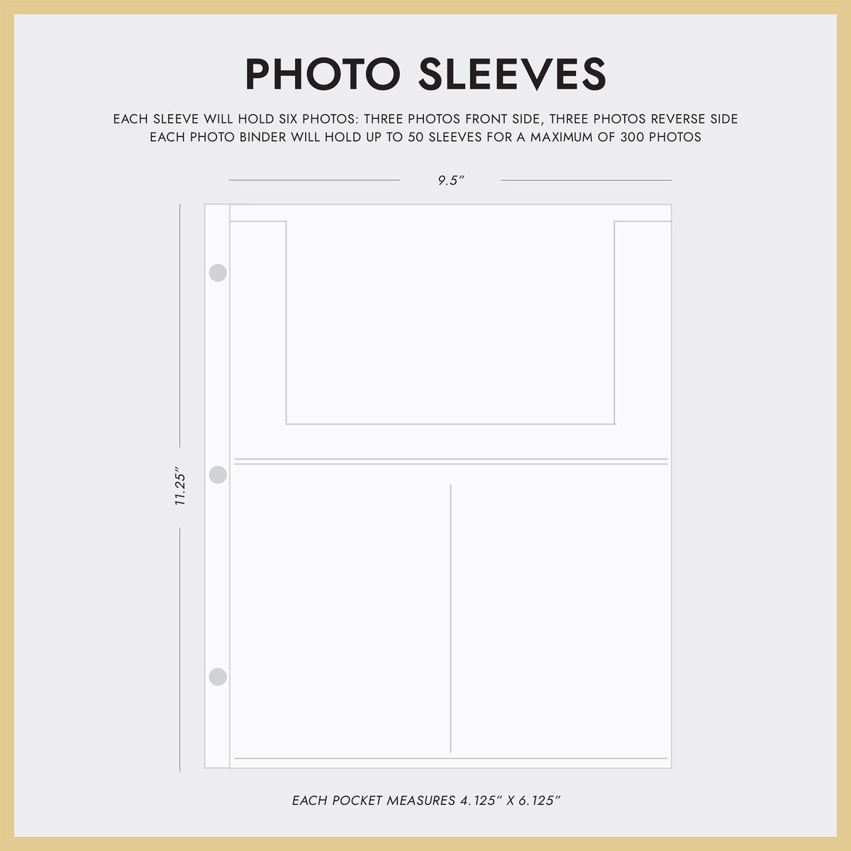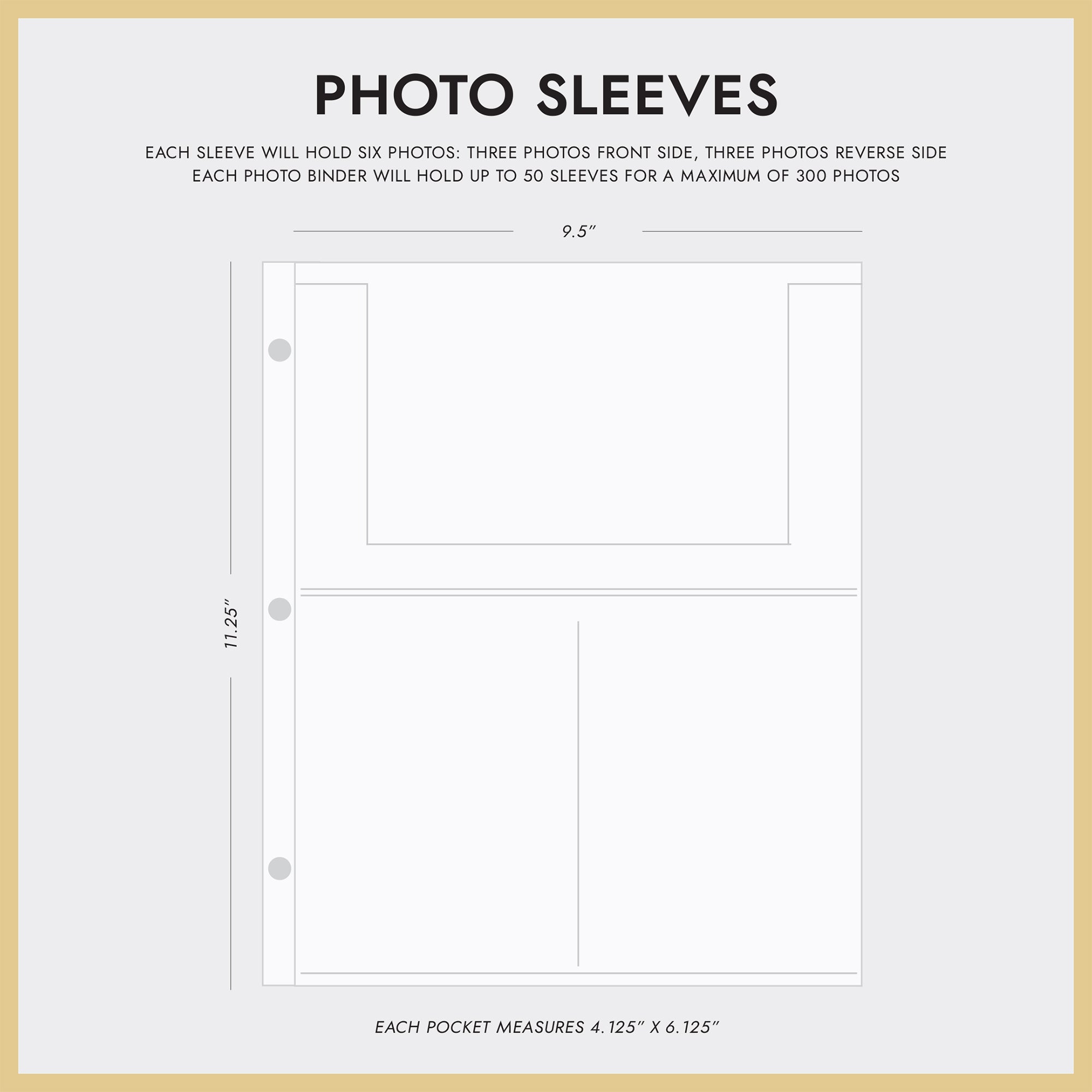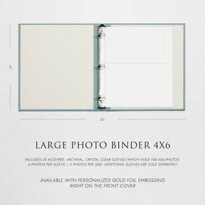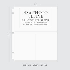 INSIDE: Photo Binders include clear sleeves, each designed to hold six 4x6 photos. Each sleeve offers versatile storage with slots for both horizontal and vertical photos. Select the 25 sleeve option for 150 photos or the 50 sleeve option to accommodate up to 300 photos. Large 4x6 Photo Binders hold a maximum of 300 photos.