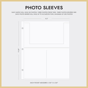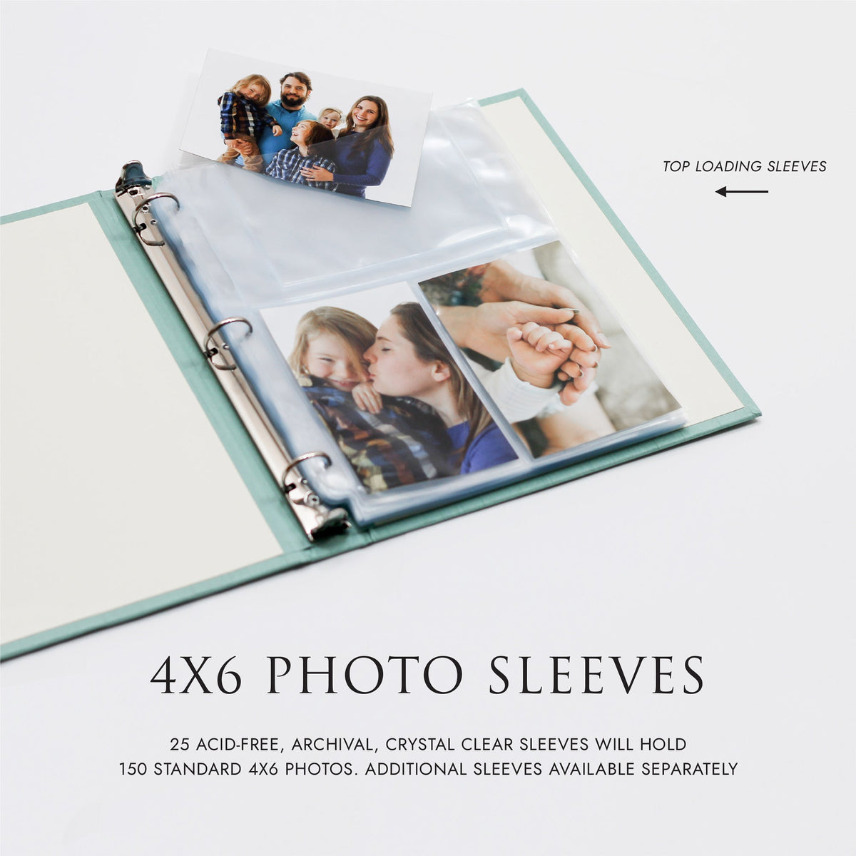 INSIDE: Photo Binders include clear sleeves, each designed to hold six 4x6 photos. Each sleeve offers versatile storage with slots for both horizontal and vertical photos. Select the 25 sleeve option for 150 photos or the 50 sleeve option to accommodate up to 300 photos. Large 4x6 Photo Binders hold a maximum of 300 photos.